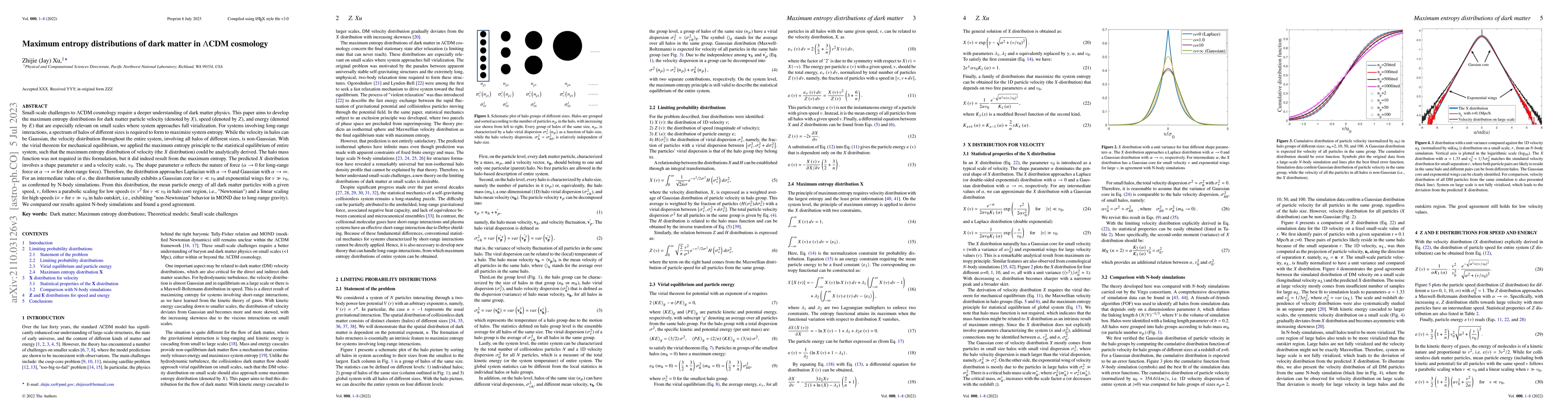 This paper develops maximum entropy distributions for dark matter velocity, speed, and energy in the $\Lambda$CDM cosmology, particularly on small scales. The derived $X$ distribution, influenced by a shape parameter $\alpha$, shows Gaussian core and exponential wings, and predicts parabolic and linear scalings for particle energy in core and outskirt regions respectively.
