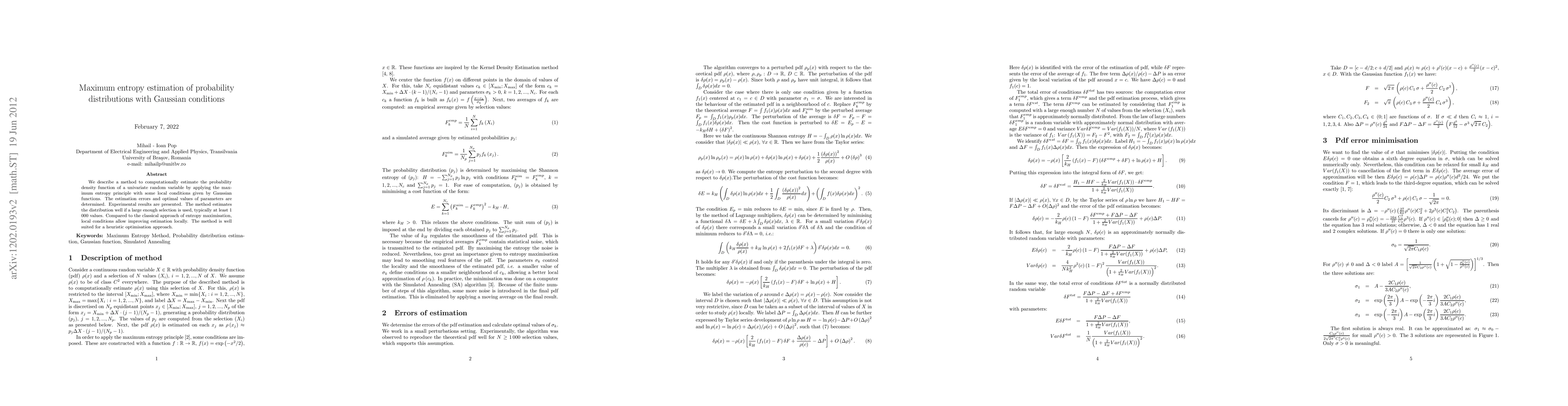 This paper proposes a method for estimating the probability density function of a univariate random variable using the maximum entropy principle with Gaussian local conditions, demonstrating improved local estimation accuracy and suitability for heuristic optimization compared to classical entropy maximization. Experimental results show the method's effectiveness with a sufficiently large sample size.