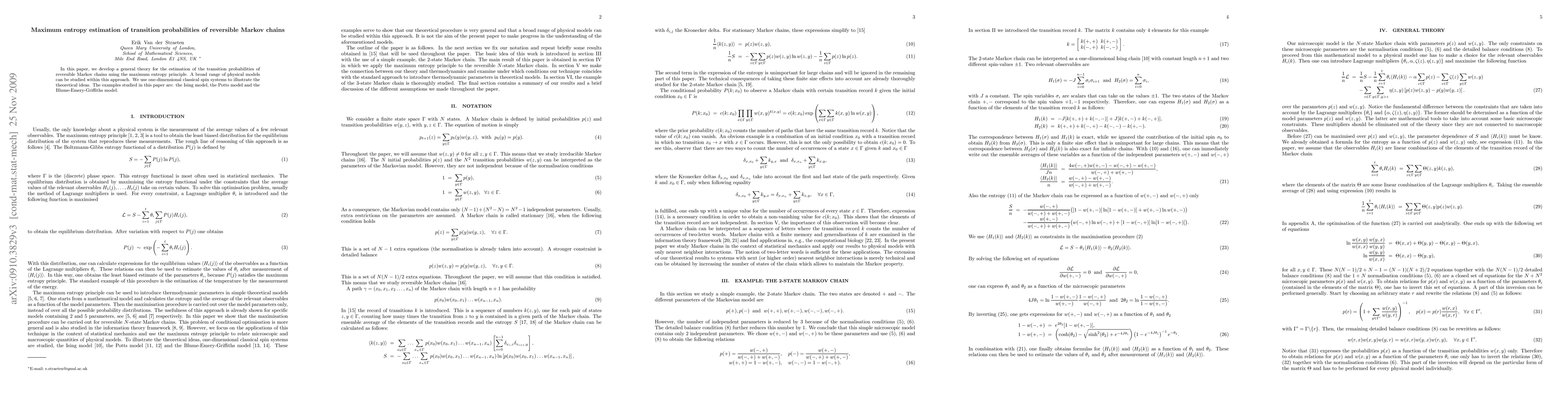 In this paper, we develop a general theory for the estimation of the transition probabilities of reversible Markov chains using the maximum entropy principle. A broad range of physical models can be studied within this approach. We use one-dimensional classical spin systems to illustrate the theoretical ideas. The examples studied in this paper are: the Ising model, the Potts model and the Blume-Emery-Griffiths model.