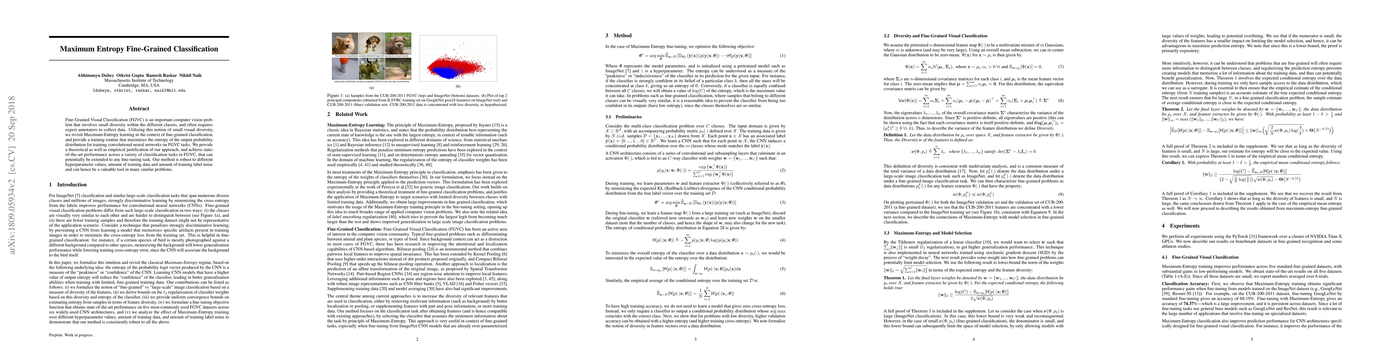 This paper proposes a Maximum-Entropy training routine for Fine-Grained Visual Classification (FGVC) that maximizes the entropy of output probability distributions, achieving state-of-the-art performance across various FGVC tasks. The method is robust to varying hyperparameters, training data, and label noise.