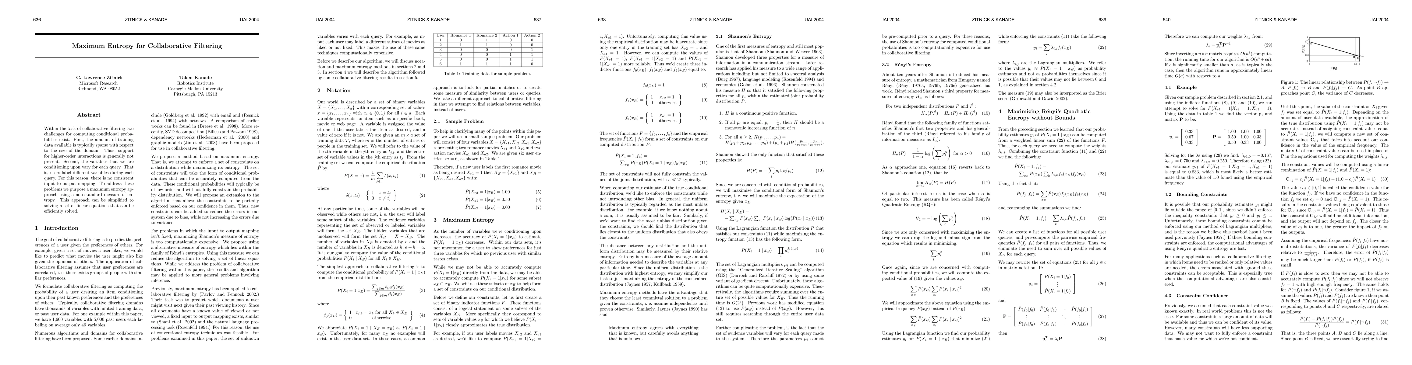 This paper proposes a maximum entropy approach for collaborative filtering to address sparse training data and variable conditioning variables. It simplifies the method to solving linear equations for efficient computation.