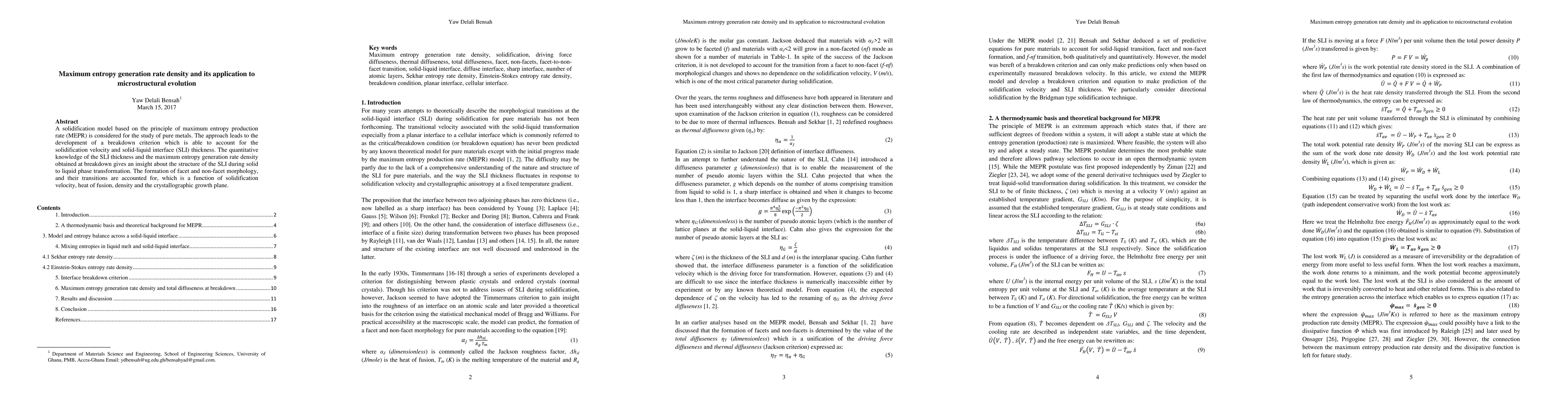This paper develops a solidification model using the principle of maximum entropy production rate to study pure metals, leading to a breakdown criterion that considers solidification velocity and solid-liquid interface thickness. The model provides insights into the SLI structure during phase transformation, accounting for the formation and transitions of facet and non-facet morphologies.