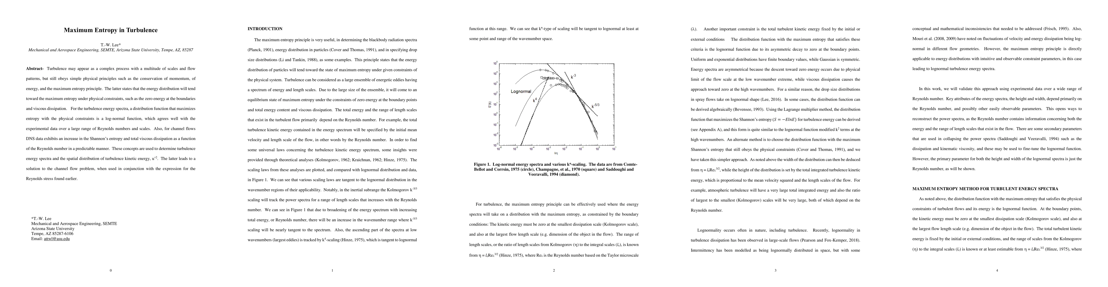 This paper explores how turbulence adheres to the maximum entropy principle under physical constraints, revealing that the log-normal function best describes the energy distribution. It also demonstrates a predictable increase in Shannon entropy and viscous dissipation in channel flows as Reynolds number rises, aiding in the determination of turbulence energy spectra and the spatial distribution of turbulence kinetic energy.