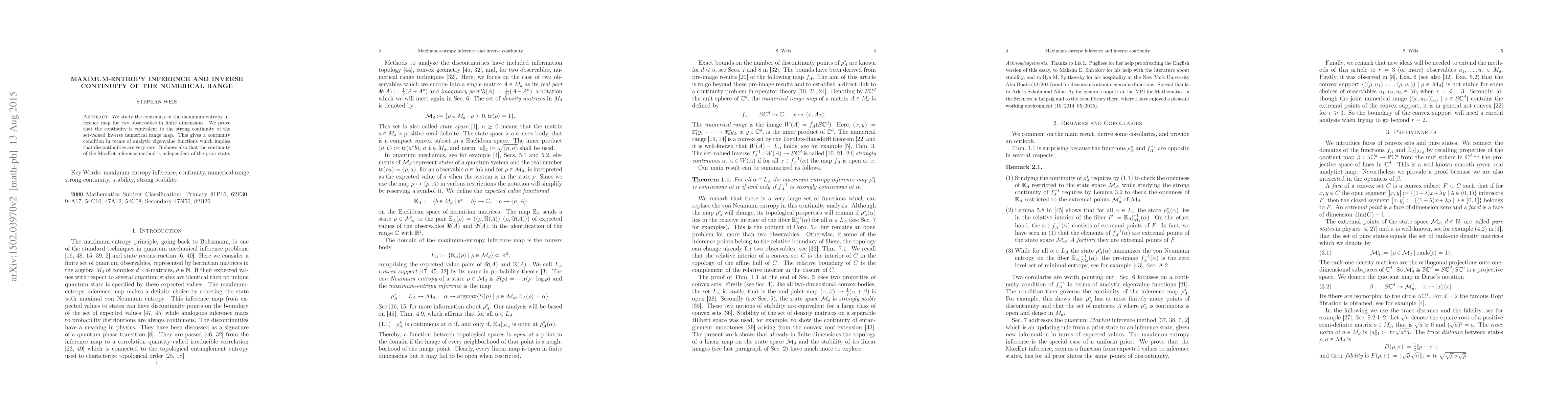 This paper investigates the continuity of the maximum-entropy inference map for two observables in finite dimensions, proving it is equivalent to the strong continuity of the inverse numerical range map. It concludes that discontinuities are rare and that the MaxEnt inference method's continuity is independent of the prior state.
