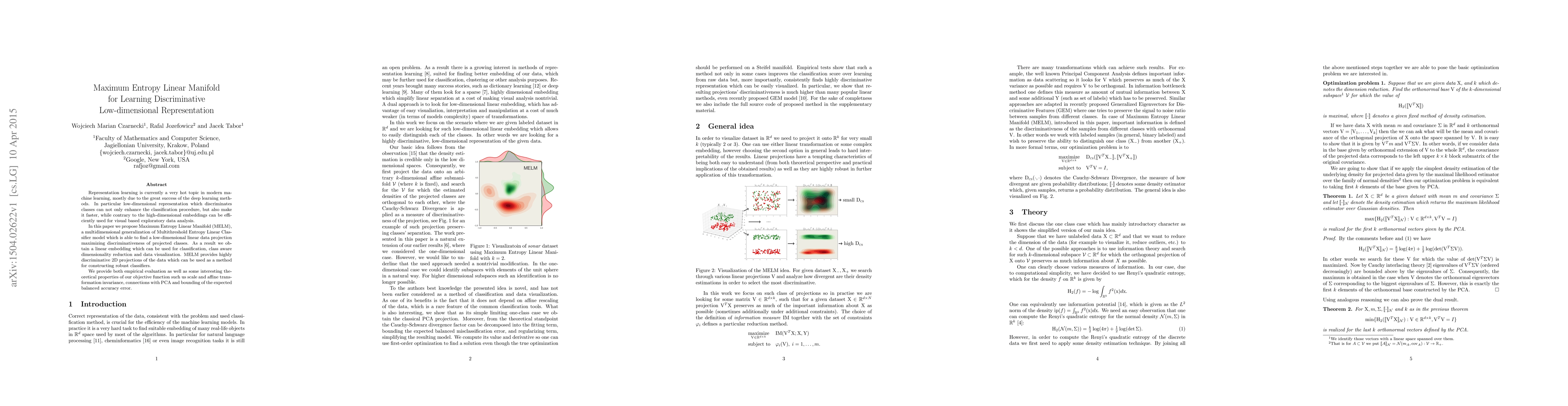 Researchers propose a new method called Maximum Entropy Linear Manifold (MELM) to learn low-dimensional representations that can enhance classification and data visualization. MELM provides highly discriminative 2D projections of data that can be used for robust classification.