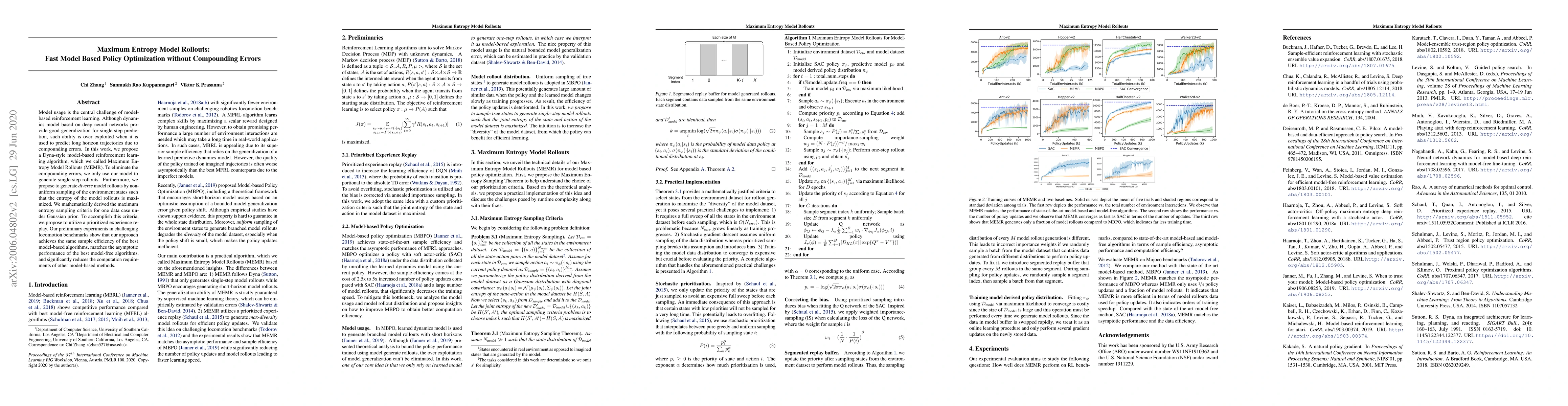 This paper proposes Maximum Entropy Model Rollouts (MEMR), a Dyna-style model-based reinforcement learning algorithm that minimizes compounding errors by generating single-step rollouts and maximizing entropy through non-uniform sampling. This approach achieves high sample efficiency and performance comparable to model-free methods.