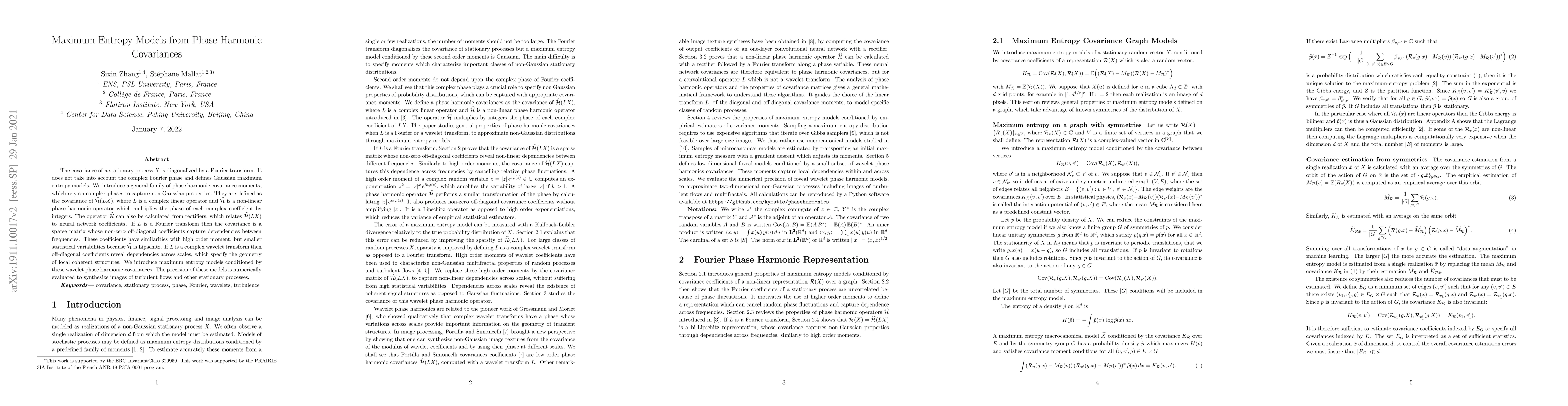 The covariance of a stationary process $X$ is diagonalized by a Fourier transform. It does not take into account the complex Fourier phase and defines Gaussian maximum entropy models. We introduce a general family of phase harmonic covariance moments, which rely on complex phases to capture non-Gaussian properties. They are defined as the covariance of $\hat{H} (L X)$, where $L$ is a complex linear operator and $\hat{H} $ is a non-linear phase harmonic operator which multiplies the phase of each complex coefficient by integers. The operator $\hat{H} (L X)$ can also be calculated from rectifiers, which relates $\hat{H} (L X)$ to neural network coefficients. If $L$ is a Fourier transform then the covariance is a sparse matrix whose non-zero off-diagonal coefficients capture dependencies between frequencies. These coefficients have similarities with high order moment, but smaller statistical variabilities because $\hat{H} (L X)$ is Lipschitz. If $L$ is a complex wavelet transform then off-diagonal coefficients reveal dependencies across scales, which specify the geometry of local coherent structures. We introduce maximum entropy models conditioned by these wavelet phase harmonic covariances. The precision of these models is numerically evaluated to synthesize images of turbulent flows and other stationary processes.