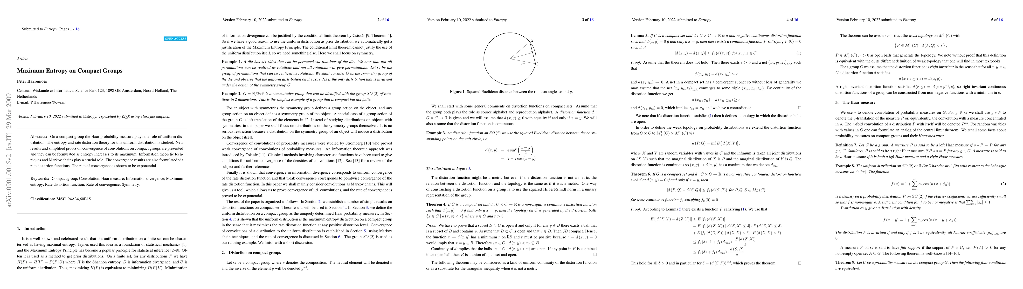 This paper explores entropy and rate distortion theory on compact groups, focusing on the Haar probability measure. It presents new results on the convergence of convolutions, showing entropy maximization and exponential convergence rates, utilizing information theory and Markov chains.