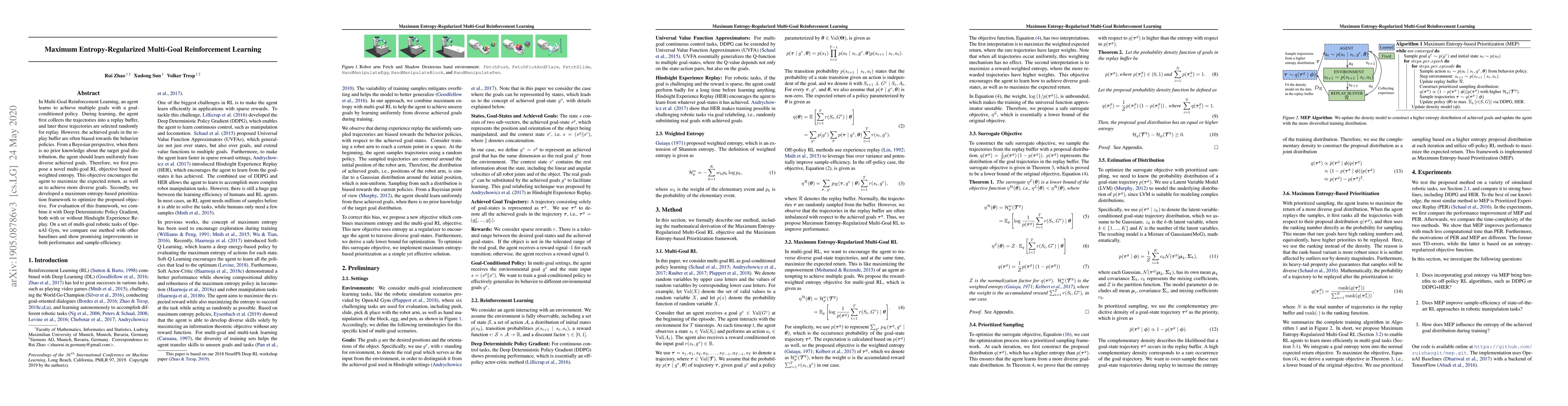 This paper proposes a maximum entropy-regularized objective for Multi-Goal Reinforcement Learning to encourage diverse goal achievement and introduces a prioritization framework to optimize this objective, demonstrating improved performance and sample efficiency on multi-goal robotic tasks.