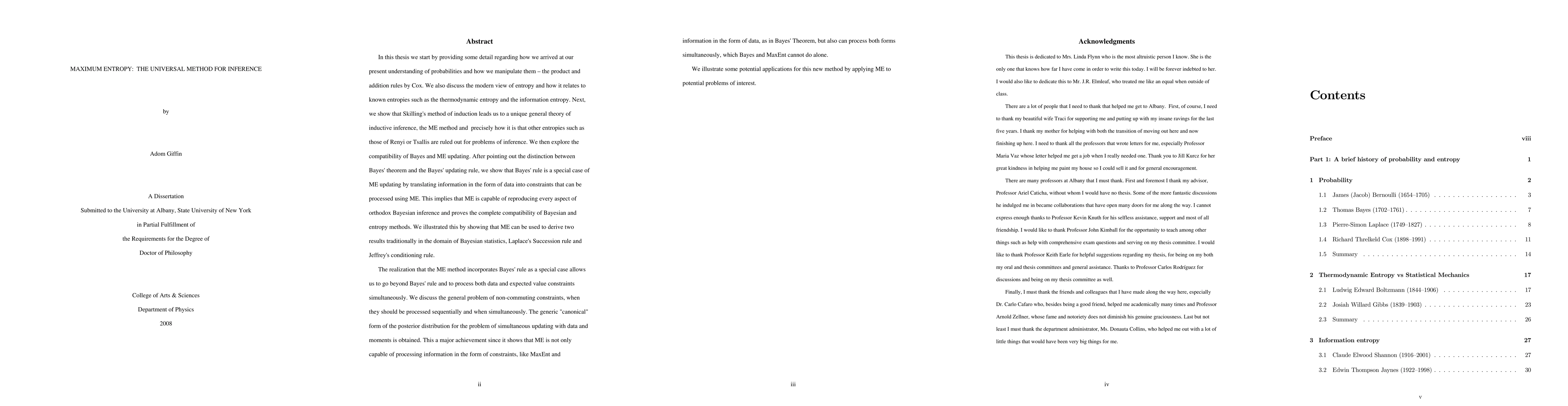 In this thesis we start by providing some detail regarding how we arrived at our present understanding of probabilities and how we manipulate them - the product and addition rules by Cox. We also discuss the modern view of entropy and how it relates to known entropies such as the thermodynamic entropy and the information entropy. Next, we show that Skilling's method of induction leads us to a unique general theory of inductive inference, the ME method and precisely how it is that other entropies such as those of Renyi or Tsallis are ruled out for problems of inference. We then explore the compatibility of Bayes and ME updating. We show that ME is capable of producing every aspect of orthodox Bayesian inference and proves the complete compatibility of Bayesian and entropy methods. The realization that the ME method incorporates Bayes' rule as a special case allows us to go beyond Bayes' rule and to process both data and expected value constraints simultaneously. We discuss the general problem of non-commuting constraints, when they should be processed sequentially and when simultaneously. The generic "canonical" form of the posterior distribution for the problem of simultaneous updating with data and moments is obtained. This is a major achievement since it shows that ME is not only capable of processing information in the form of constraints, like MaxEnt and information in the form of data, as in Bayes' Theorem, but also can process both forms simultaneously, which Bayes and MaxEnt cannot do alone. Finally, we illustrate some potential applications for this new method by applying ME to potential problems of interest.
