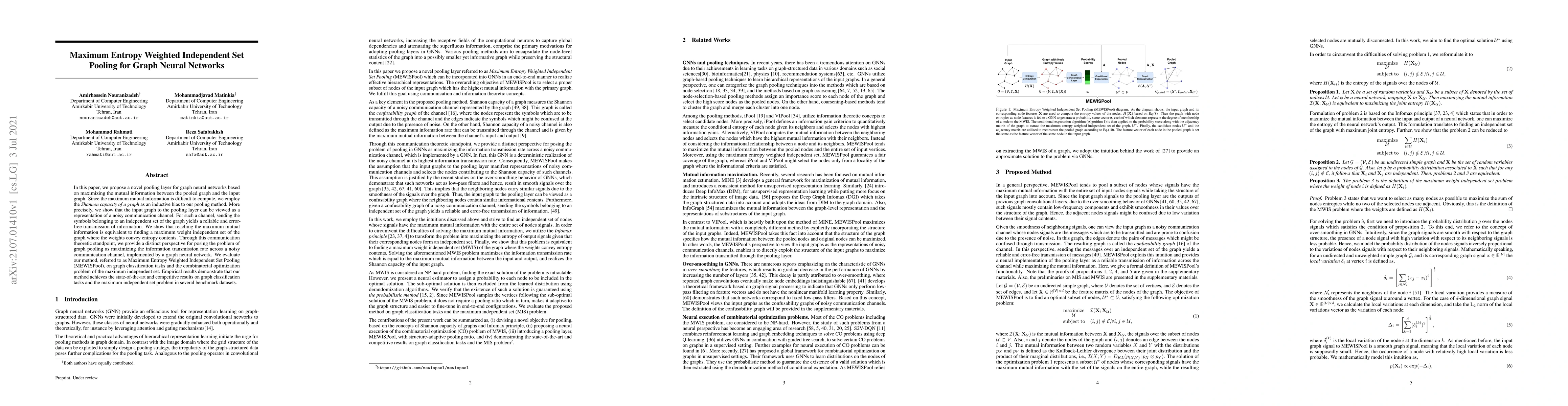 This paper introduces MEWISPool, a novel pooling layer for graph neural networks that maximizes mutual information by finding a maximum entropy weighted independent set. It leverages the Shannon capacity to address the computational challenge and demonstrates state-of-the-art performance on graph classification and maximum independent set problems.