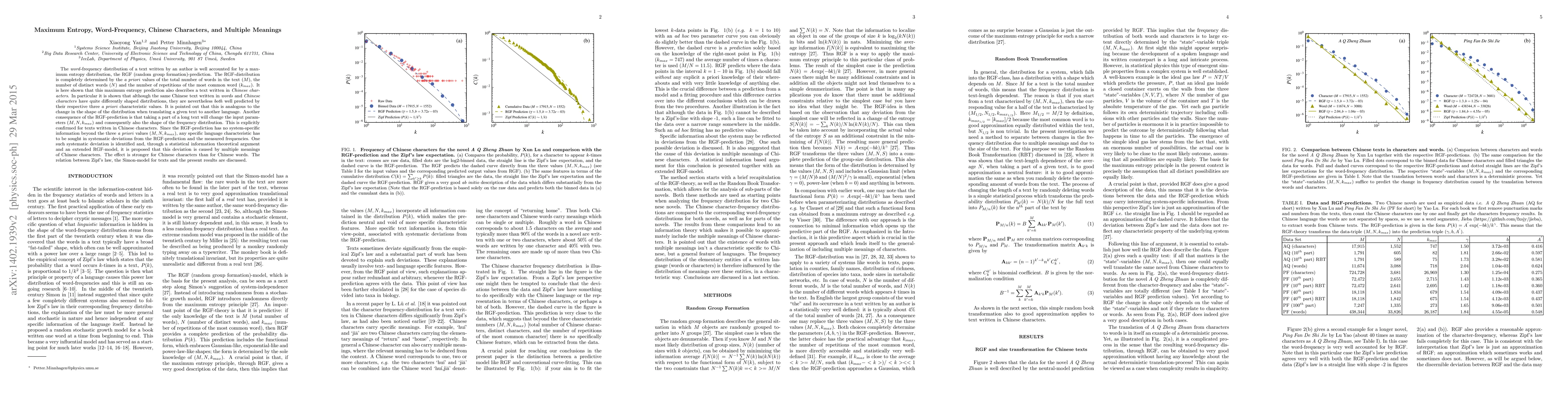 The word-frequency distribution of a text written by an author is well accounted for by a maximum entropy distribution, the RGF (random group formation)-prediction. The RGF-distribution is completely determined by the a priori values of the total number of words in the text (M), the number of distinct words (N) and the number of repetitions of the most common word (k_max). It is here shown that this maximum entropy prediction also describes a text written in Chinese characters. In particular it is shown that although the same Chinese text written in words and Chinese characters have quite differently shaped distributions, they are nevertheless both well predicted by their respective three a priori characteristic values. It is pointed out that this is analogous to the change in the shape of the distribution when translating a given text to another language. Another consequence of the RGF-prediction is that taking a part of a long text will change the input parameters (M, N, k_max) and consequently also the shape of the frequency distribution. This is explicitly confirmed for texts written in Chinese characters. Since the RGF-prediction has no system-specific information beyond the three a priori values (M, N, k_max), any specific language characteristic has to be sought in systematic deviations from the RGF-prediction and the measured frequencies. One such systematic deviation is identified and, through a statistical information theoretical argument and an extended RGF-model, it is proposed that this deviation is caused by multiple meanings of Chinese characters. The effect is stronger for Chinese characters than for Chinese words. The relation between Zipf's law, the Simon-model for texts and the present results are discussed.