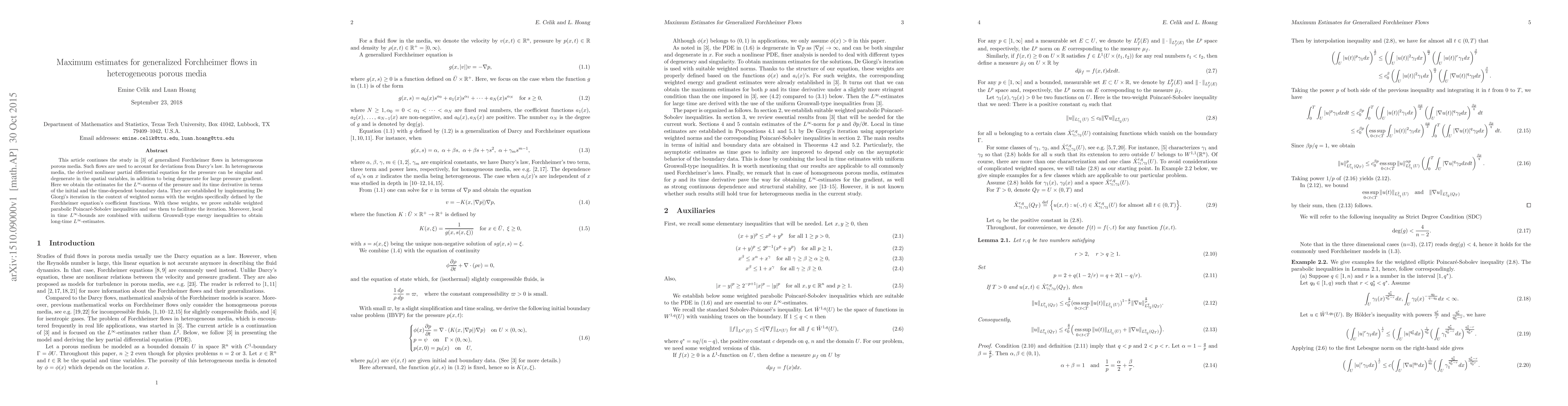 This paper provides maximum estimates for generalized Forchheimer flows in heterogeneous porous media, addressing the nonlinear partial differential equations that arise. It employs De Giorgi's iteration and weighted norms to establish $L^\infty$-norm bounds for pressure and its time derivative, leveraging parabolic Poincaré-Sobolev inequalities and Gronwall-type energy inequalities for long-term stability.