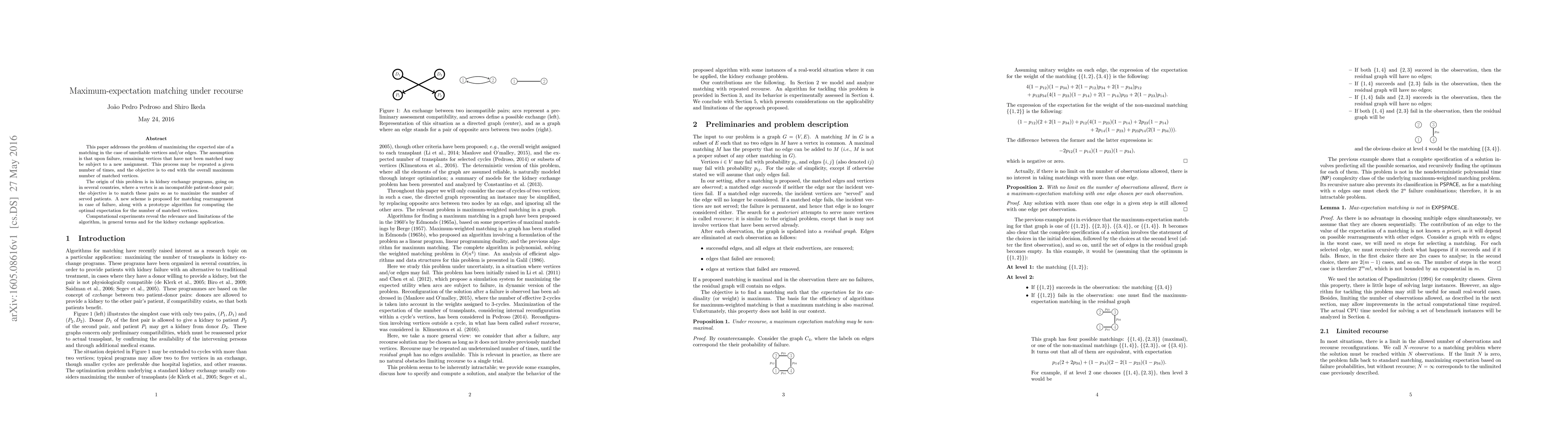 This paper addresses the problem of maximizing the expected size of a matching in the case of unreliable vertices and/or edges. The assumption is that upon failure, remaining vertices that have not been matched may be subject to a new assignment. This process may be repeated a given number of times, and the objective is to end with the overall maximum number of matched vertices. The origin of this problem is in kidney exchange programs, going on in several countries, where a vertex is an incompatible patient-donor pair; the objective is to match these pairs so as to maximize the number of served patients. A new scheme is proposed for matching rearrangement in case of failure, along with a prototype algorithm for computing the optimal expectation for the number of matched vertices. Computational experiments reveal the relevance and limitations of the algorithm, in general terms and for the kidney exchange application.