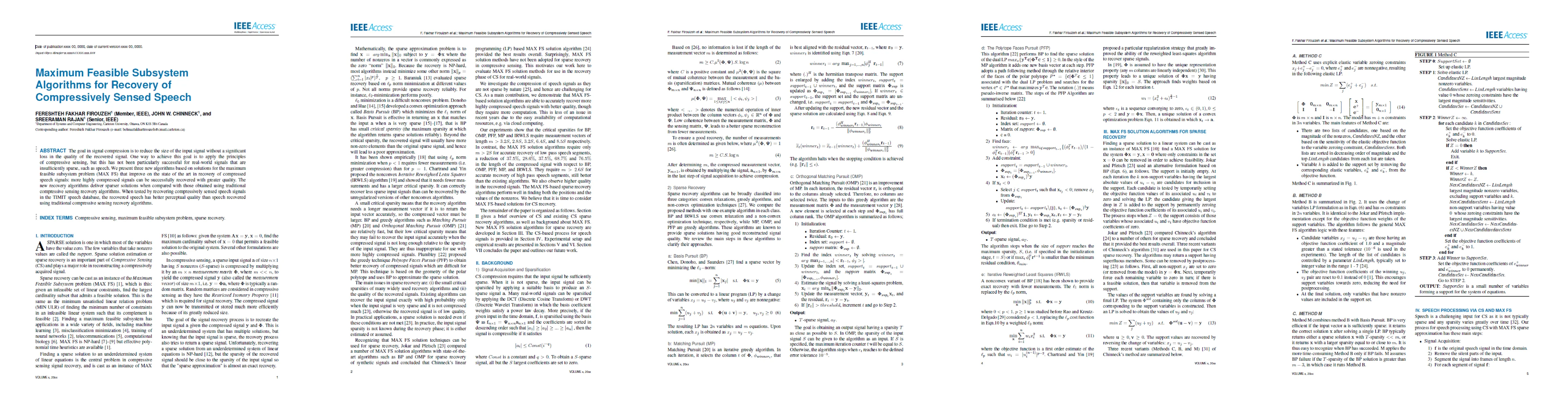 The goal in signal compression is to reduce the size of the input signal without a significant loss in the quality of the recovered signal. One way to achieve this goal is to apply the principles of compressive sensing, but this has not been particularly successful for real-world signals that are insufficiently sparse, such as speech. We present three new algorithms based on solutions for the maximum feasible subsystem problem (MAX FS) that improve on the state of the art in recovery of compressed speech signals: more highly compressed signals can be successfully recovered with greater quality. The new recovery algorithms deliver sparser solutions when compared with those obtained using traditional compressive sensing recovery algorithms. When tested by recovering compressively sensed speech signals in the TIMIT speech database, the recovered speech has better perceptual quality than speech recovered using traditional compressive sensing recovery algorithms.