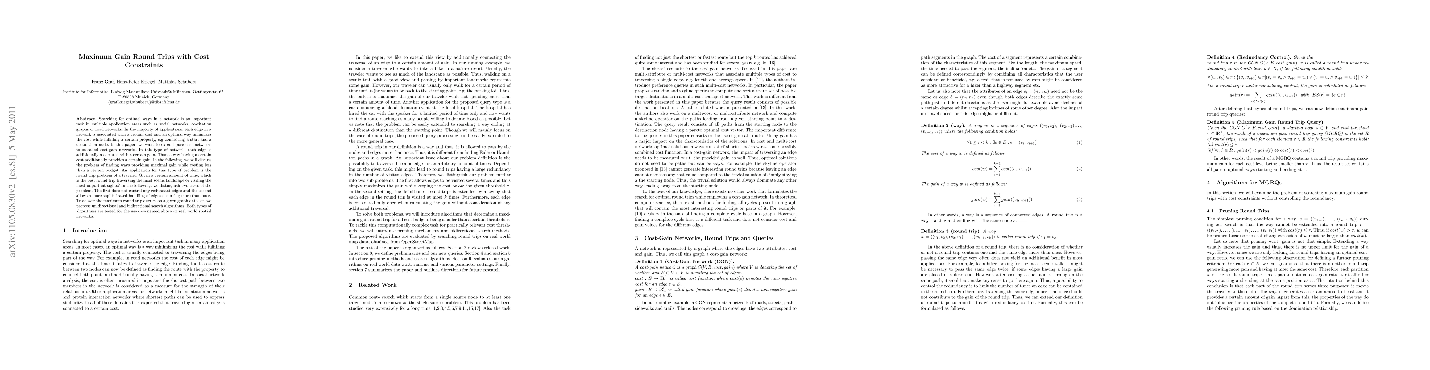 Searching for optimal ways in a network is an important task in multiple application areas such as social networks, co-citation graphs or road networks. In the majority of applications, each edge in a network is associated with a certain cost and an optimal way minimizes the cost while fulfilling a certain property, e.g connecting a start and a destination node. In this paper, we want to extend pure cost networks to so-called cost-gain networks. In this type of network, each edge is additionally associated with a certain gain. Thus, a way having a certain cost additionally provides a certain gain. In the following, we will discuss the problem of finding ways providing maximal gain while costing less than a certain budget. An application for this type of problem is the round trip problem of a traveler: Given a certain amount of time, which is the best round trip traversing the most scenic landscape or visiting the most important sights? In the following, we distinguish two cases of the problem. The first does not control any redundant edges and the second allows a more sophisticated handling of edges occurring more than once. To answer the maximum round trip queries on a given graph data set, we propose unidirectional and bidirectional search algorithms. Both types of algorithms are tested for the use case named above on real world spatial networks.