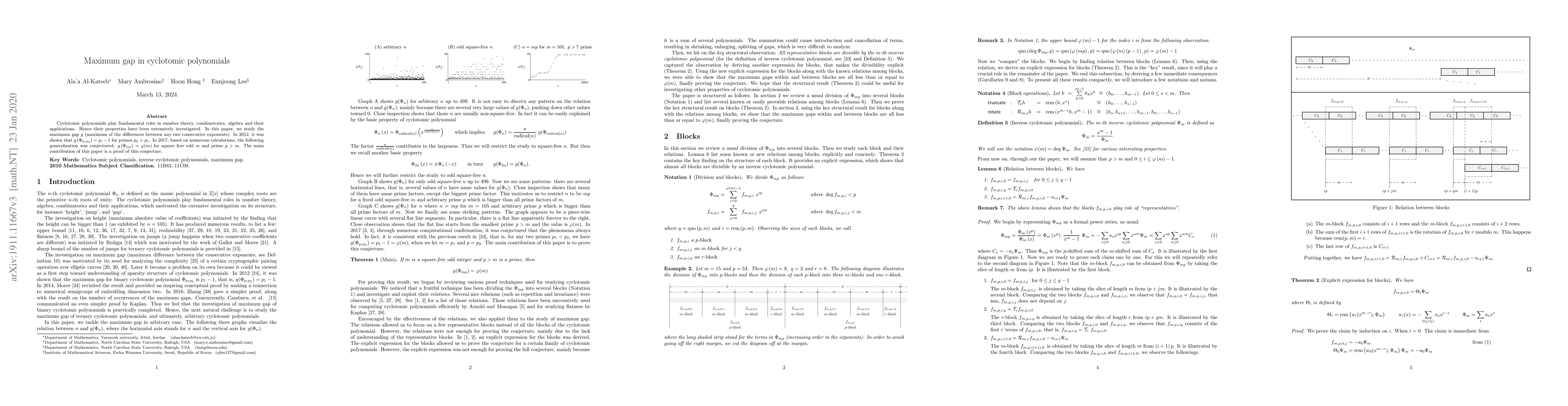 Cyclotomic polynomials play fundamental roles in number theory, combinatorics, algebra and their applications. Hence their properties have been extensively investigated. In this paper, we study the maximum gap $g$ (maximum of the differences between any two consecutive exponents). In 2012, it was shown that $g\left( \Phi_{p_{1}p_{2}}\right) =p_{1} -1$ for primes $p_{2}>p_{1}$. In 2017, based on numerous calculations, the following generalization was conjectured: $g\left( \Phi_{mp}\right) =\varphi(m)$ for square free odd $m$ and prime $p>m$. The main contribution of this paper is a proof of this conjecture.