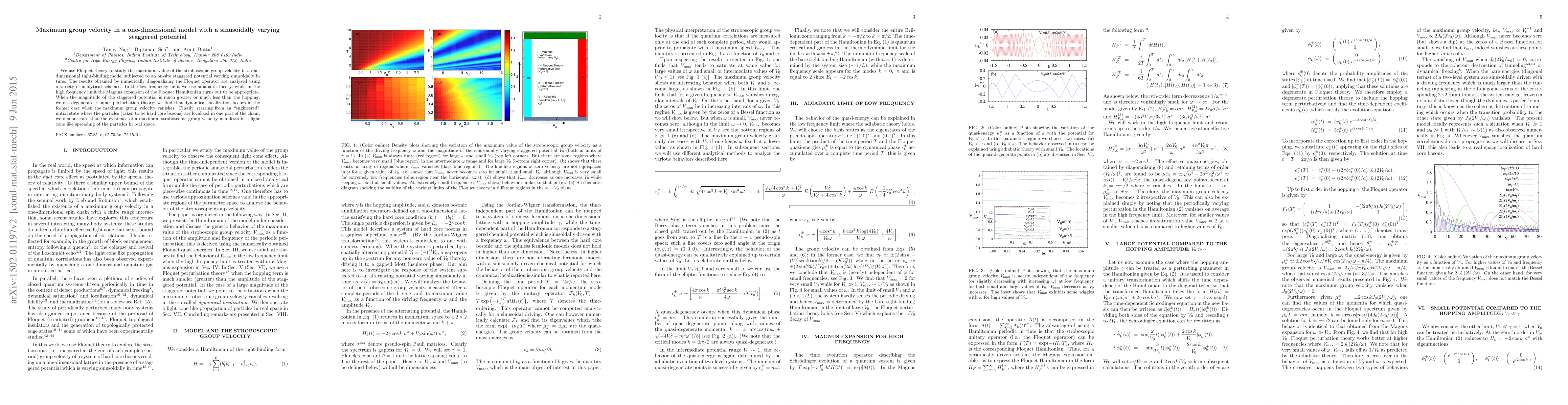 We use Floquet theory to study the maximum value of the stroboscopic group velocity in a one-dimensional tight-binding model subjected to an on-site staggered potential varying sinusoidally in time. The results obtained by numerically diagonalizing the Floquet operator are analyzed using a variety of analytical schemes. In the low frequency limit we use adiabatic theory, while in the high frequency limit the Magnus expansion of the Floquet Hamiltonian turns out to be appropriate. When the magnitude of the staggered potential is much greater or much less than the hopping, we use degenerate Floquet perturbation theory; we find that dynamical localization occurs in the former case when the maximum group velocity vanishes. Finally, starting from an "engineered" initial state where the particles (taken to be hard core bosons) are localized in one part of the chain, we demonstrate that the existence of a maximum stroboscopic group velocity manifests in a light cone like spreading of the particles in real space.