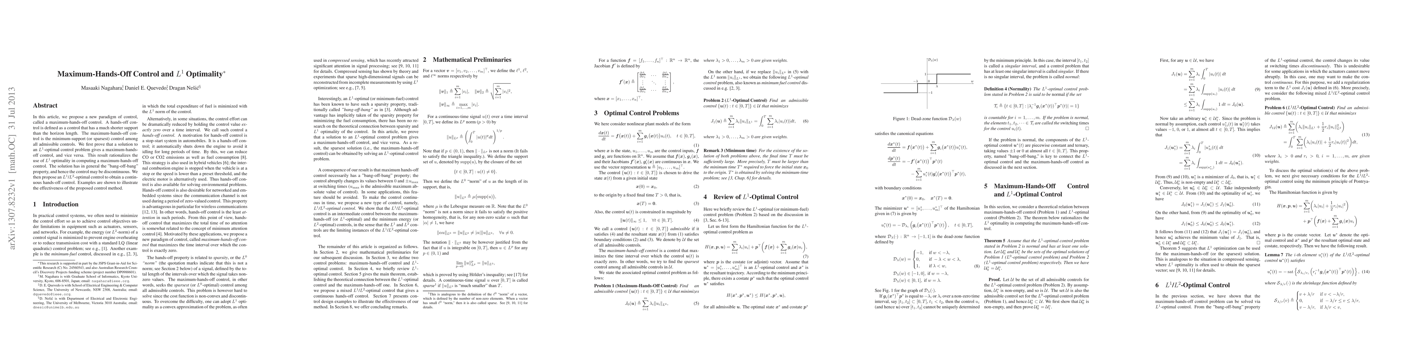In this article, we propose a new paradigm of control, called a maximum-hands-off control. A hands-off control is defined as a control that has a much shorter support than the horizon length. The maximum-hands-off control is the minimum-support (or sparsest) control among all admissible controls. We first prove that a solution to an L1-optimal control problem gives a maximum-hands-off control, and vice versa. This result rationalizes the use of L1 optimality in computing a maximum-hands-off control. The solution has in general the "bang-off-bang" property, and hence the control may be discontinuous. We then propose an L1/L2-optimal control to obtain a continuous hands-off control. Examples are shown to illustrate the effectiveness of the proposed control method.