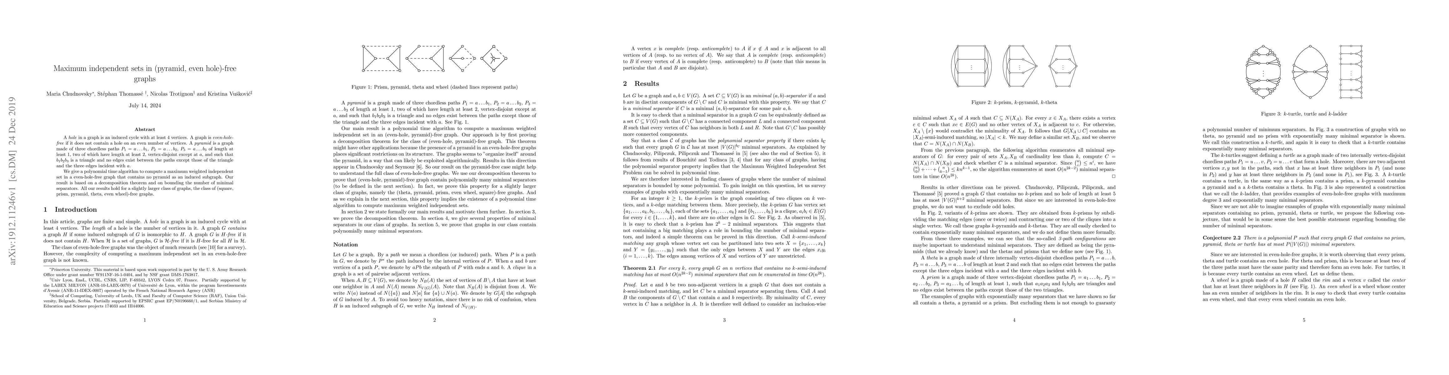 This paper presents a polynomial-time algorithm to compute a maximum weighted independent set in even-hole-free graphs that do not contain pyramids as induced subgraphs, leveraging a decomposition theorem and bounds on minimal separators. The findings also extend to a broader class of (square, prism, pyramid, theta, even wheel)-free graphs.