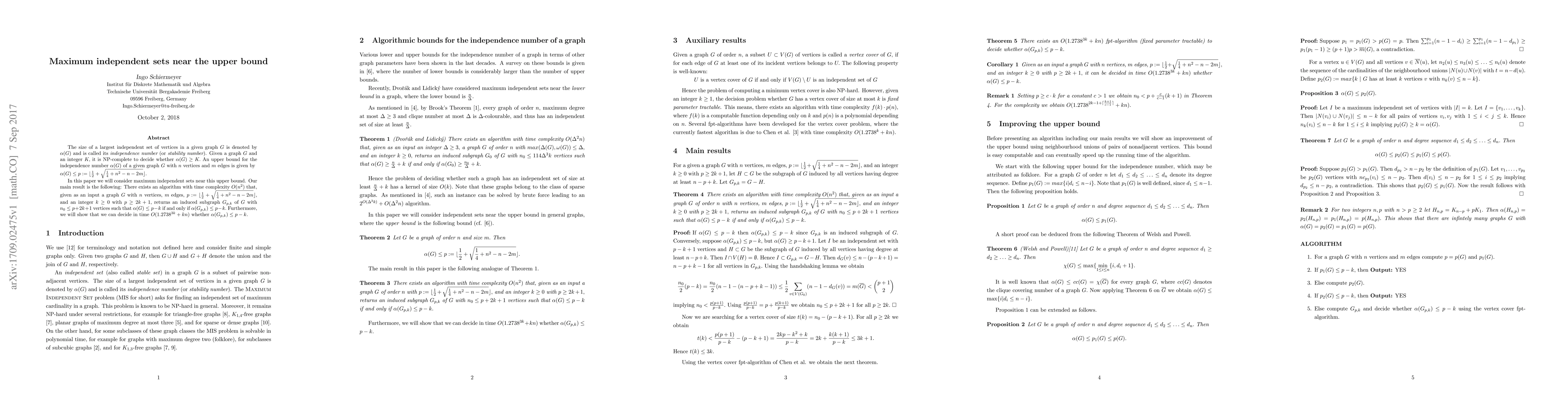 The size of a largest independent set of vertices in a given graph $G$ is denoted by $\alpha(G)$ and is called its independence number (or stability number). Given a graph $G$ and an integer $K,$ it is NP-complete to decide whether $\alpha(G) \geq K.$ An upper bound for the independence number $\alpha(G)$ of a given graph $G$ with $n$ vertices and $m $ edges is given by $\alpha(G) \leq p:=\lfloor\frac{1}{2} + \sqrt{\frac{1}{4} + n^2 - n - 2m}\rfloor.$ In this paper we will consider maximum independent sets near this upper bound. Our main result is the following: There exists an algorithm with time complexity $O(n^2)$ that, given as an input a graph $G$ with $n$ vertices, $m$ edges, $p:=\lfloor\frac{1}{2} + \sqrt{\frac{1}{4} + n^2 - n - 2m}\rfloor,$ and an integer $k \geq 0$ with $p \geq 2k+1,$ returns an induced subgraph $G_{p,k}$ of $G$ with $n_0 \leq p+2k+1$ vertices such that $\alpha(G) \leq p-k$ if and only if $\alpha(G_{p,k}) \leq p-k.$ Furthermore, we will show that we can decide in time $O(1.2738^{3k} + kn)$ whether $\alpha(G_{p,k}) \leq p-k.$