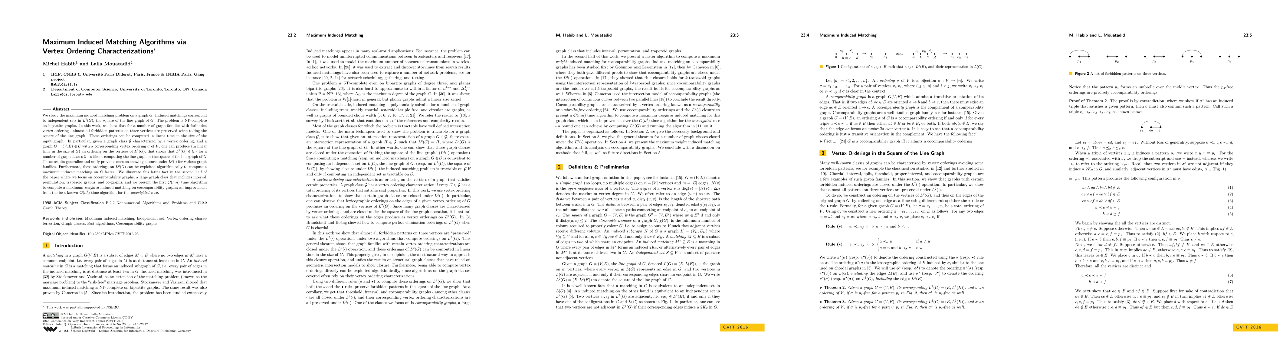 We study the maximum induced matching problem on a graph g. Induced matchings correspond to independent sets in L2(g), the square of the line graph of g. The problem is NP-complete on bipartite graphs. In this work, we show that for a number of graph families with forbidden vertex orderings, almost all forbidden patterns on three vertices are preserved when taking the square of the line graph. These orderings can be computed in linear time in the size of the input graph. In particular, given a graph class G characterized by a vertex ordering, and a graph g = (V, E) in G with a corresponding vertex ordering \sigma of V , one can produce (in linear time in the size of g) an ordering on the vertices of L2(g), that shows that L2(g) in G - for a number of graph classes G - without computing the line graph or the square of the line graph of g. These results generalize and unify previous ones on showing closure under L2(.) for various graph families. Furthermore, these orderings on L2(g) can be exploited algorithmically to compute a maximum induced matching on G faster. We illustrate this latter fact in the second half of the paper where we focus on cocomparability graphs, a large graph class that includes interval, permutation, trapezoid graphs, and co-graphs, and we present the first O(mn) time algorithm to compute a maximum weighted induced matching on cocomparability graphs; an improvement from the best known O(n4) time algorithm for the unweighted case.