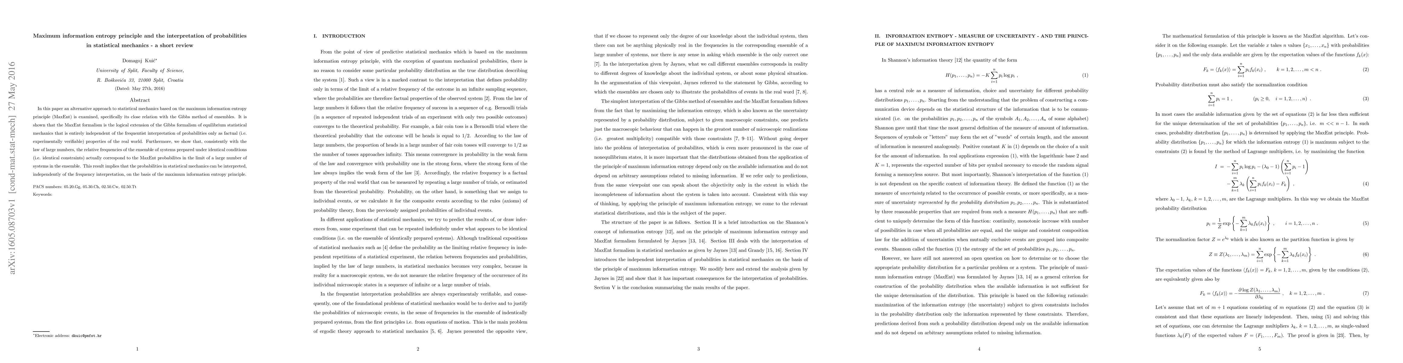 This paper explores the maximum information entropy principle (MaxEnt) as an alternative approach to statistical mechanics, demonstrating its equivalence to the Gibbs ensemble method. It argues that MaxEnt probabilities can be interpreted independently of frequentist interpretations, aligning with the law of large numbers.