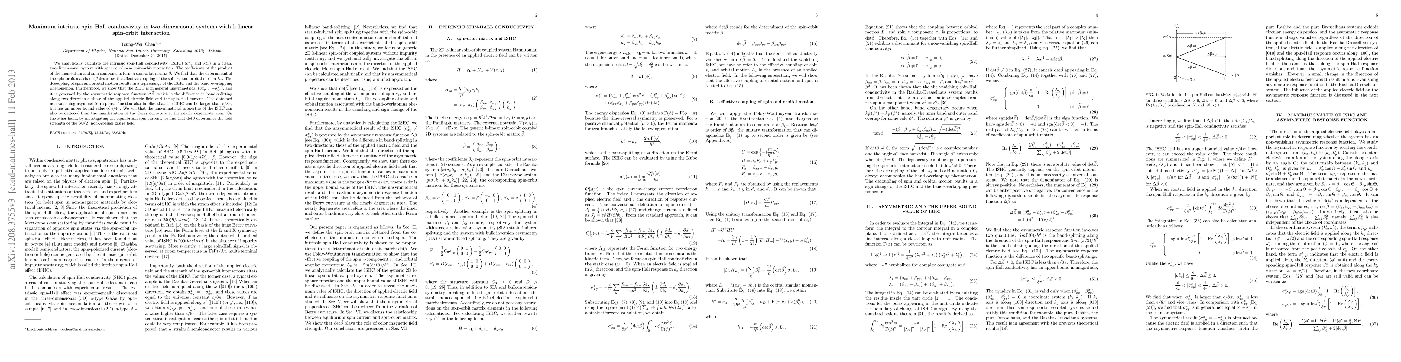 This paper analytically calculates the intrinsic spin-Hall conductivity in two-dimensional systems with k-linear spin-orbit interaction, revealing that the determinant of the spin-orbit matrix governs the effective coupling between spin and orbital motion, leading to an unsymmetrical ISHC with an upper bound of $e/4\pi$.