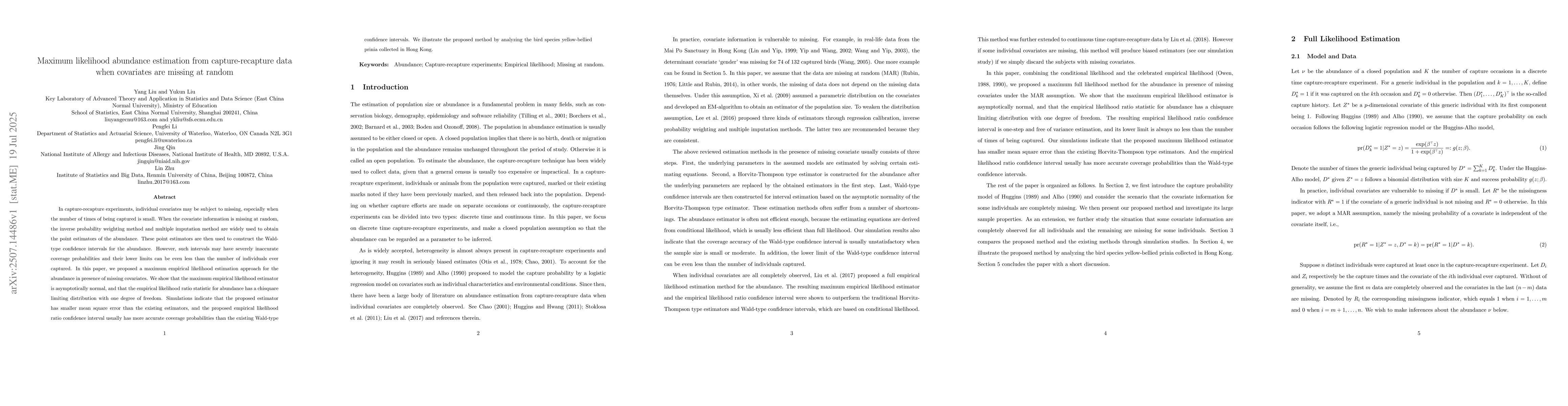 In capture-recapture experiments, individual covariates may be subject to missing, especially when the number of times of being captured is small. When the covariate information is missing at random, the inverse probability weighting method and multiple imputation method are widely used to obtain the point estimators of the abundance. These point estimators are then used to construct the Wald-type confidence intervals for the abundance. However, such intervals may have severely inaccurate coverage probabilities and their lower limits can be even less than the number of individuals ever captured. In this paper, we proposed a maximum empirical likelihood estimation approach for the abundance in presence of missing covariates. We show that the maximum empirical likelihood estimator is asymptotically normal, and that the empirical likelihood ratio statistic for abundance has a chisquare limiting distribution with one degree of freedom. Simulations indicate that the proposed estimator has smaller mean square error than the existing estimators, and the proposed empirical likelihood ratio confidence interval usually has more accurate coverage probabilities than the existing Wald-type confidence intervals. We illustrate the proposed method by analyzing the bird species yellow-bellied prinia collected in Hong Kong.