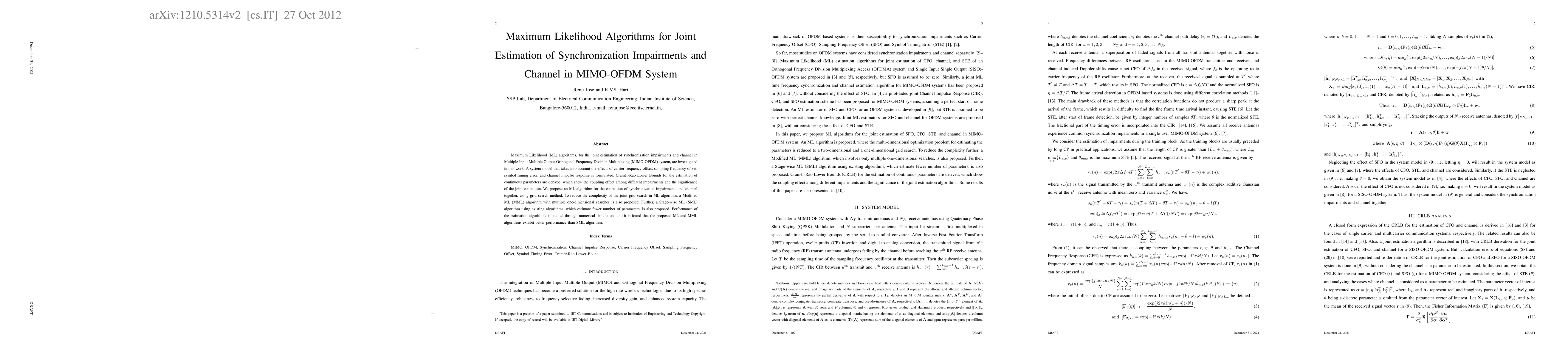 This paper investigates Maximum Likelihood (ML) algorithms for jointly estimating synchronization impairments and channel in MIMO-OFDM systems. It proposes an ML algorithm using grid search, a Modified ML (MML) algorithm with reduced complexity, and a Stage-wise ML (SML) algorithm, with numerical simulations showing the ML and MML algorithms outperform the SML in performance.