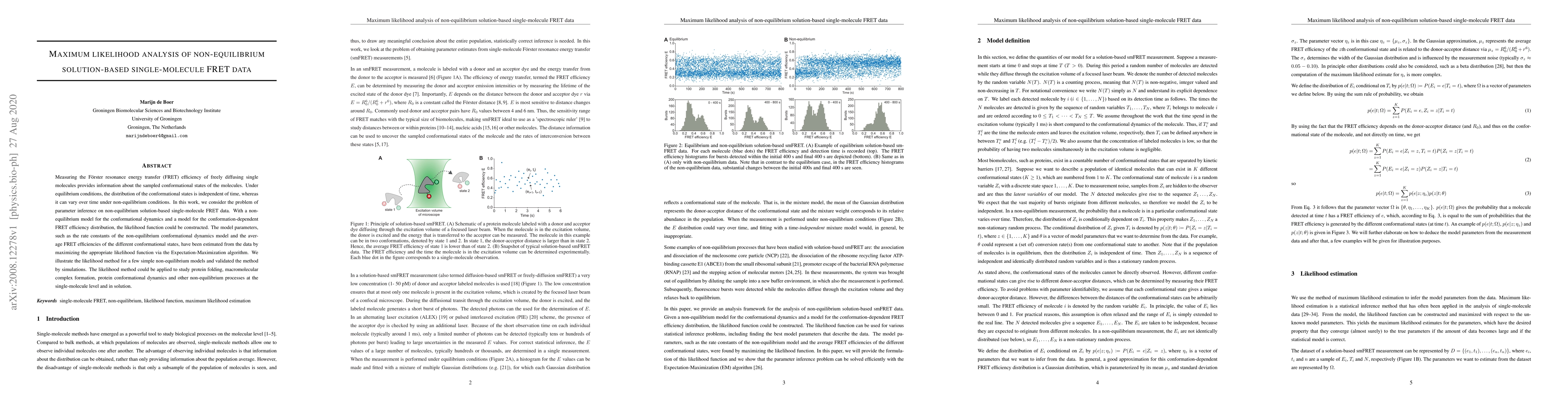 This paper develops a maximum likelihood method for analyzing non-equilibrium single-molecule FRET data, estimating parameters like rate constants and FRET efficiencies using the Expectation-Maximization algorithm, and demonstrates its application to study non-equilibrium processes like protein folding and dynamics.