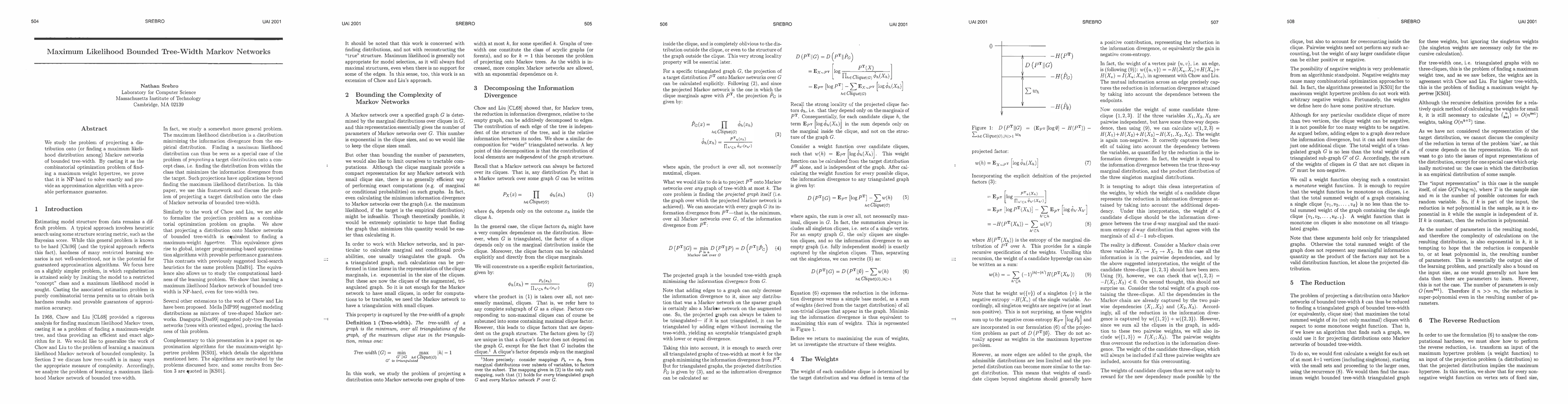 Chow and Liu (1968) studied the problem of learning a maximumlikelihood Markov tree. We generalize their work to more complexMarkov networks by considering the problem of learning a maximumlikelihood Markov network of bounded complexity. We discuss howtree-width is in many ways the appropriate measure of complexity andthus analyze the problem of learning a maximum likelihood Markovnetwork of bounded tree-width.Similar to the work of Chow and Liu, we are able to formalize thelearning problem as a combinatorial optimization problem on graphs. Weshow that learning a maximum likelihood Markov network of boundedtree-width is equivalent to finding a maximum weight hypertree. Thisequivalence gives rise to global, integer-programming based,approximation algorithms with provable performance guarantees, for thelearning problem. This contrasts with heuristic local-searchalgorithms which were previously suggested (e.g. by Malvestuto 1991).The equivalence also allows us to study the computational hardness ofthe learning problem. We show that learning a maximum likelihoodMarkov network of bounded tree-width is NP-hard, and discuss thehardness of approximation.