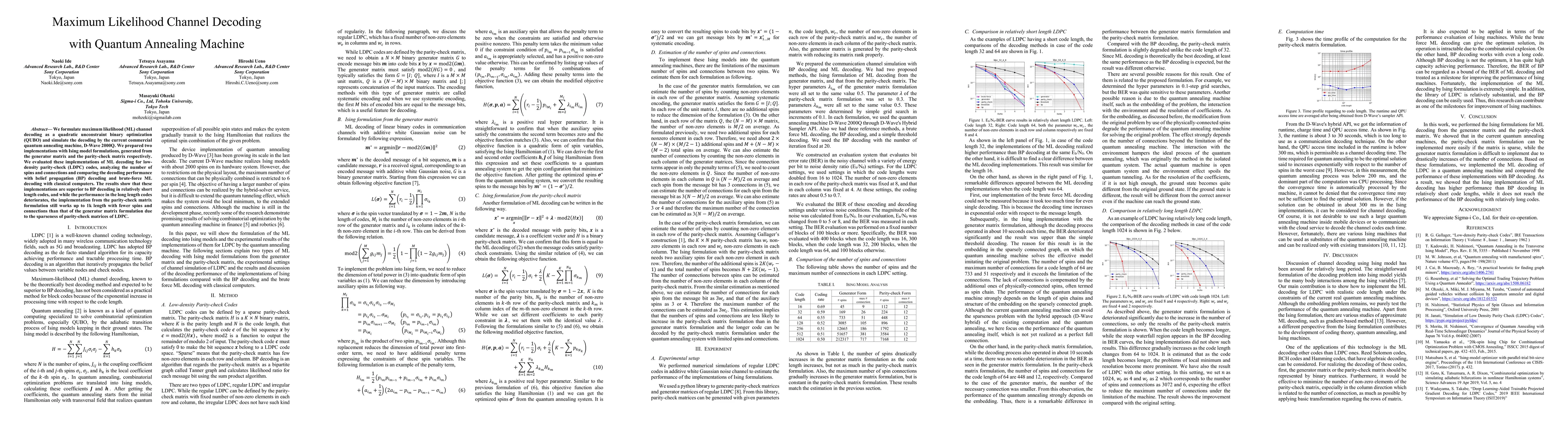 This research paper presents a method to simulate maximum likelihood (ML) channel decoding using a quantum annealing machine, D-Wave 2000Q. The study formulates ML decoding as a quadratic unconstraint binary optimization (QUBO) problem and compares its performance with belief propagation (BP) decoding and brute-force ML decoding on classical computers. The results indicate that the quantum annealing implementations outperform BP decoding for shorter LDPC codes and, although performance decreases for longer codes, the parity-check matrix formulation maintains effectiveness up to 1k length with fewer computational resources.