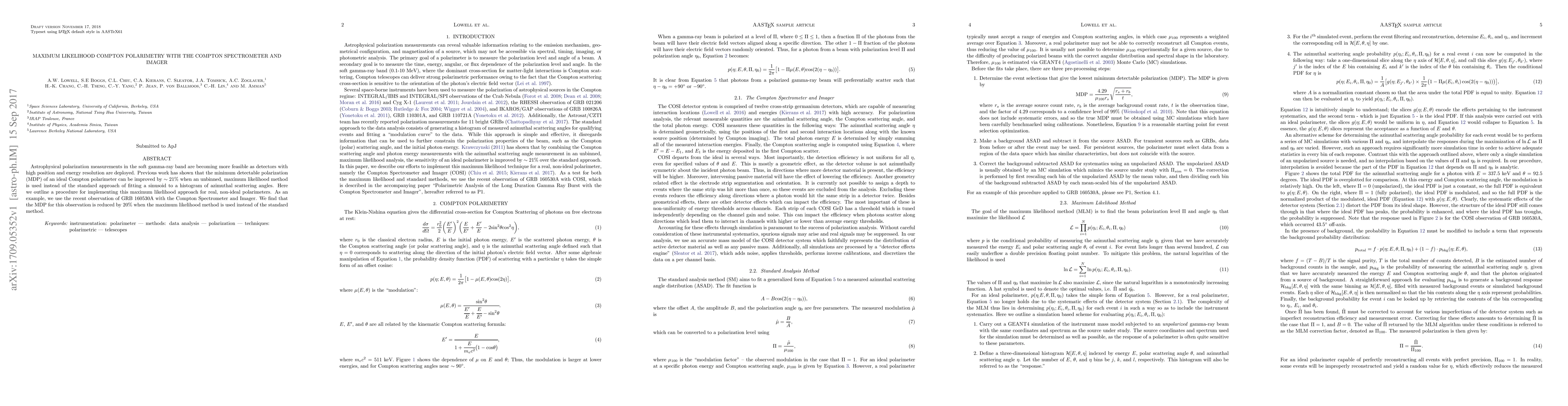 Astrophysical polarization measurements in the soft gamma-ray band are becoming more feasible as detectors with high position and energy resolution are deployed. Previous work has shown that the minimum detectable polarization (MDP) of an ideal Compton polarimeter can be improved by $\sim 21\%$ when an unbinned, maximum likelihood method is used instead of the standard approach of fitting a sinusoid to a histogram of azimuthal scattering angles. Here we outline a procedure for implementing this maximum likelihood approach for real, non-ideal polarimeters. As an example, we use the recent observation of GRB 160530A with the Compton Spectrometer and Imager. We find that the MDP for this observation is reduced by $20\%$ when the maximum likelihood method is used instead of the standard method.