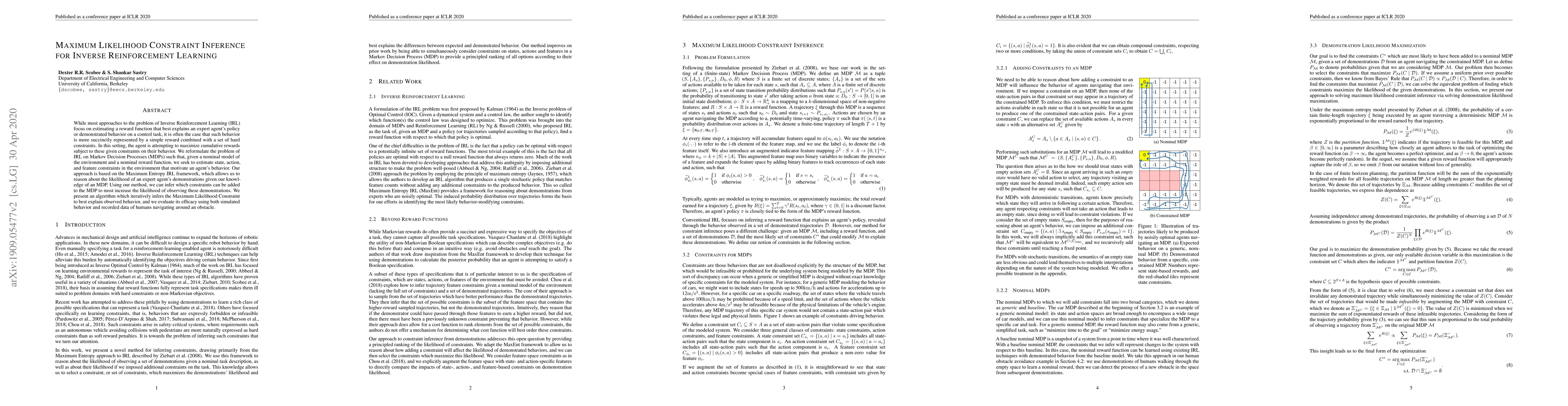 This paper proposes a method for Inverse Reinforcement Learning that infers constraints alongside a reward function to better explain an expert agent's behavior. It reformulates the problem using Maximum Entropy IRL to identify state, action, and feature constraints that align with observed demonstrations, and presents an iterative algorithm for inferring the Maximum Likelihood Constraint. The approach is evaluated on both simulated and human navigation data.