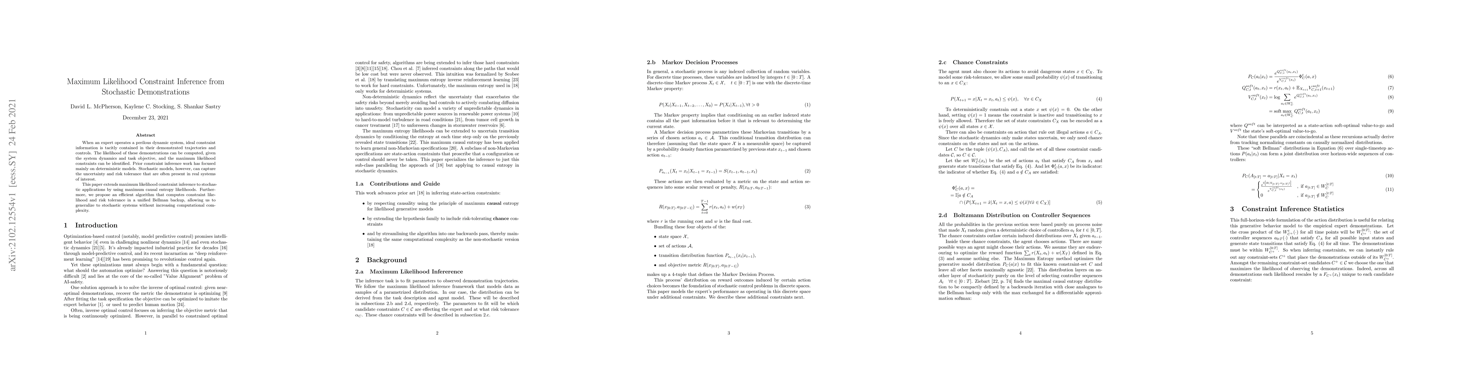 This paper extends maximum likelihood constraint inference to stochastic systems using maximum causal entropy likelihoods, proposing an efficient algorithm that computes constraint likelihood and risk tolerance in a unified Bellman backup, thus generalizing to stochastic systems without increased computational complexity.