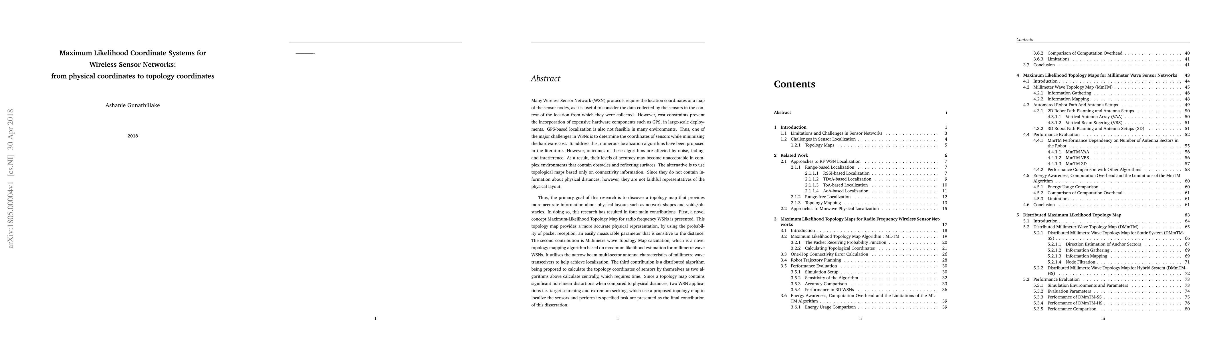 Many WSN protocols require the location coordinates of the sensor nodes, as it is useful to consider the data collected by the sensors in the context of the location from which they were collected. Thus, one of the major challenges in WSNs is to determine the coordinates of sensors while minimizing the hardware cost. To address this, numerous localization algorithms have been proposed in the literature. However, outcomes of these algorithms are affected by noise, fading, and interference. As a result, their levels of accuracy may become unacceptable in complex environments that contain obstacles and reflecting surfaces. The alternative is to use topological maps based only on connectivity information. Since they do not contain information about physical distances, however, they are not faithful representatives of the physical layout. Thus, the primary goal of this research is to discover a topology map that provides more accurate information about physical layouts. In doing so, this research has resulted in four main contributions. First, a novel concept Maximum-Likelihood Topology Map for RF WSNs is presented. This topology map provides a more accurate physical representation, by using the probability of packet reception. The second contribution is Millimetre wave Topology Map calculation, which is a novel topology mapping algorithm based on maximum likelihood estimation for millimetre wave WSNs. The third contribution is a distributed algorithm being proposed to calculate the topology coordinates of sensors by themselves as two algorithms above calculate centrally, which requires time. Since a topology map contains significant non-linear distortions, two WSN applications i.e. target searching and extremum seeking, which use a proposed topology map to localize the sensors and perform its specified task are presented as the final contribution of this dissertation.