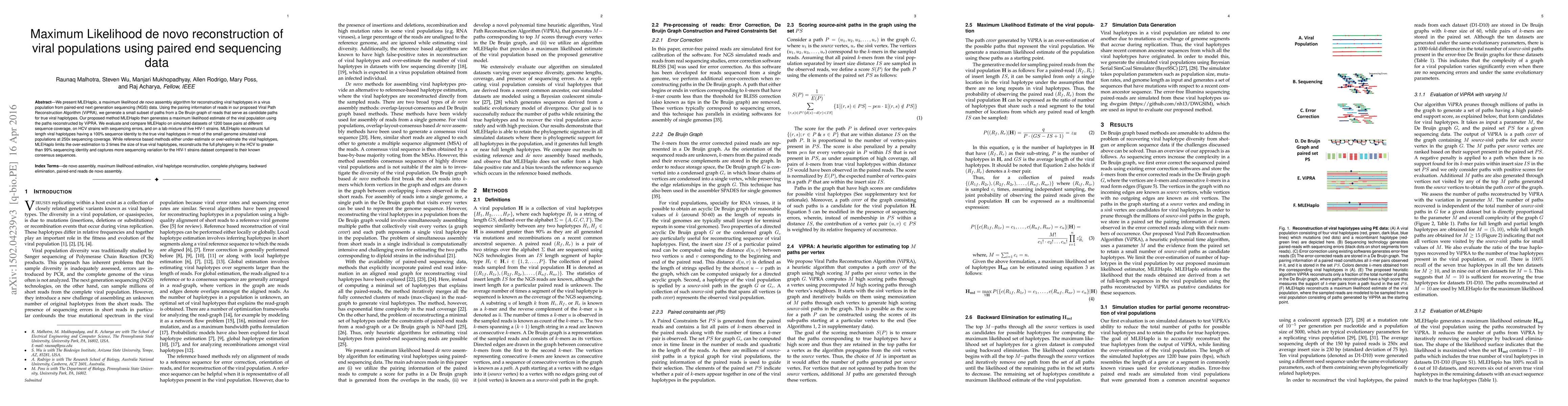 MLEHaplo is a novel maximum likelihood algorithm for reconstructing viral haplotypes from paired-end sequencing data, employing a Viral Path Reconstruction Algorithm to generate candidate paths. It outperforms reference-based methods by achieving 100% sequence identity in small genome simulations and capturing more variation in HIV-1 strains.