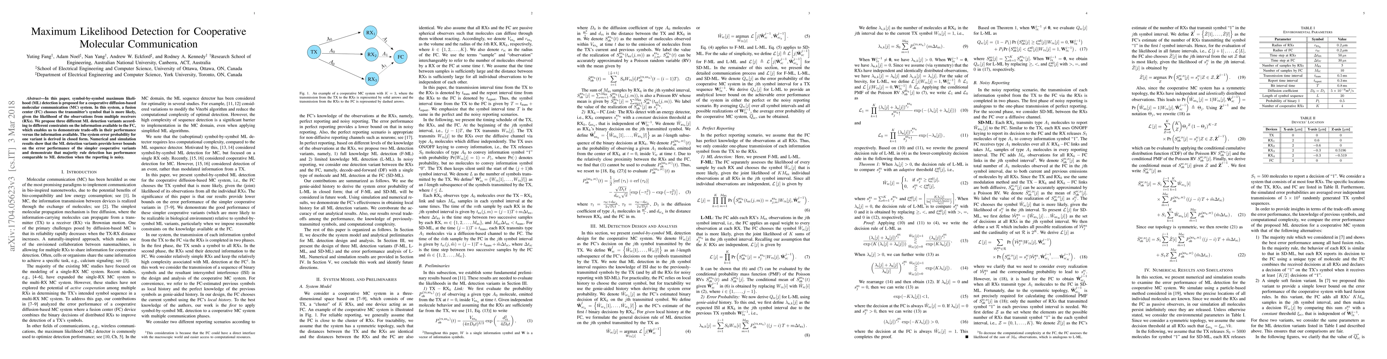 This paper proposes symbol-by-symbol maximum likelihood detection for cooperative molecular communication systems, introducing three ML detection variants based on varying information constraints. The study demonstrates performance trade-offs and shows that majority rule detection can match ML detection under noisy reporting conditions.