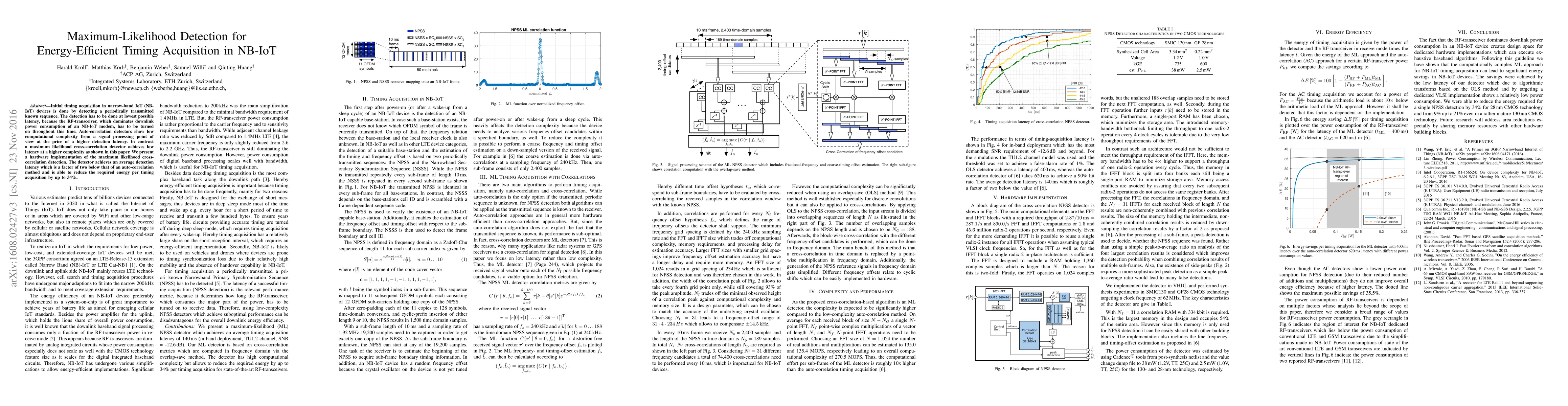 The research presents a hardware implementation of a maximum likelihood cross-correlation detector for energy-efficient timing acquisition in NB-IoT, focusing on low latency rather than low complexity.