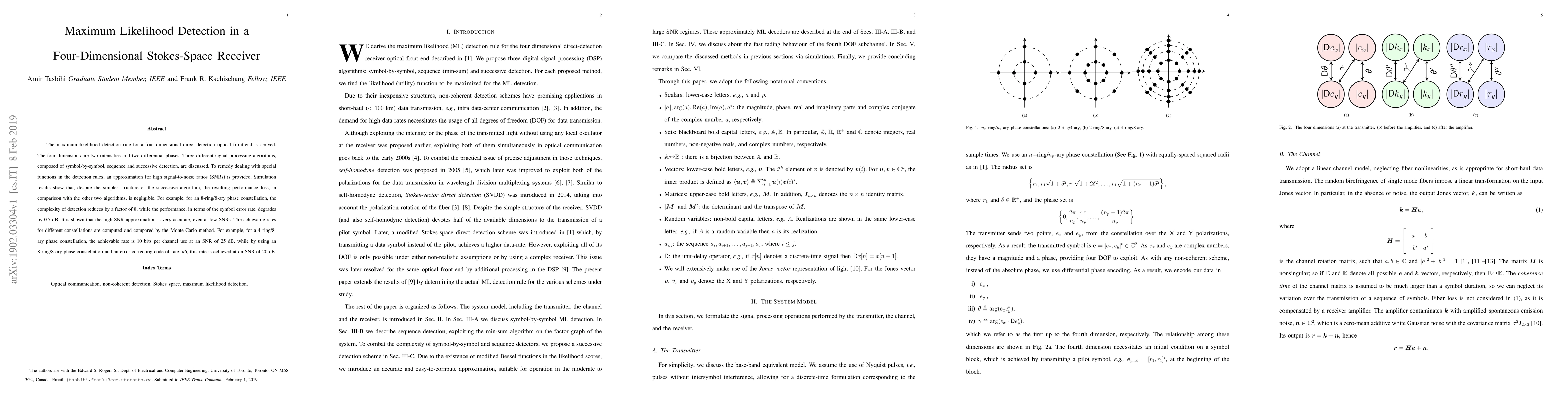 The maximum likelihood detection rule for a four-dimensional direct-detection optical front-end is derived. The four dimensions are two intensities and two differential phases. Three different signal processing algorithms, composed of symbol-by-symbol, sequence and successive detection, are discussed. To remedy dealing with special functions in the detection rules, an approximation for high signal-to-noise ratios (SNRs) is provided. Simulation results show that, despite the simpler structure of the successive algorithm, the resulting performance loss, in comparison with the other two algorithms, is negligible. For example, for an 8-ring/8-ary phase constellation, the complexity of detection reduces by a factor of 8, while the performance, in terms of the symbol error rate, degrades by 0.5 dB. It is shown that the high-SNR approximation is very accurate, even at low SNRs. The achievable rates for different constellations are computed and compared by the Monte Carlo method. For example, for a 4-ring/8-ary phase constellation, the achievable rate is 10 bits per channel use at an SNR of 25 dB, while by using an 8-ring/8-ary phase constellation and an error correcting code of rate 5/6, this rate is achieved at an SNR of 20 dB.