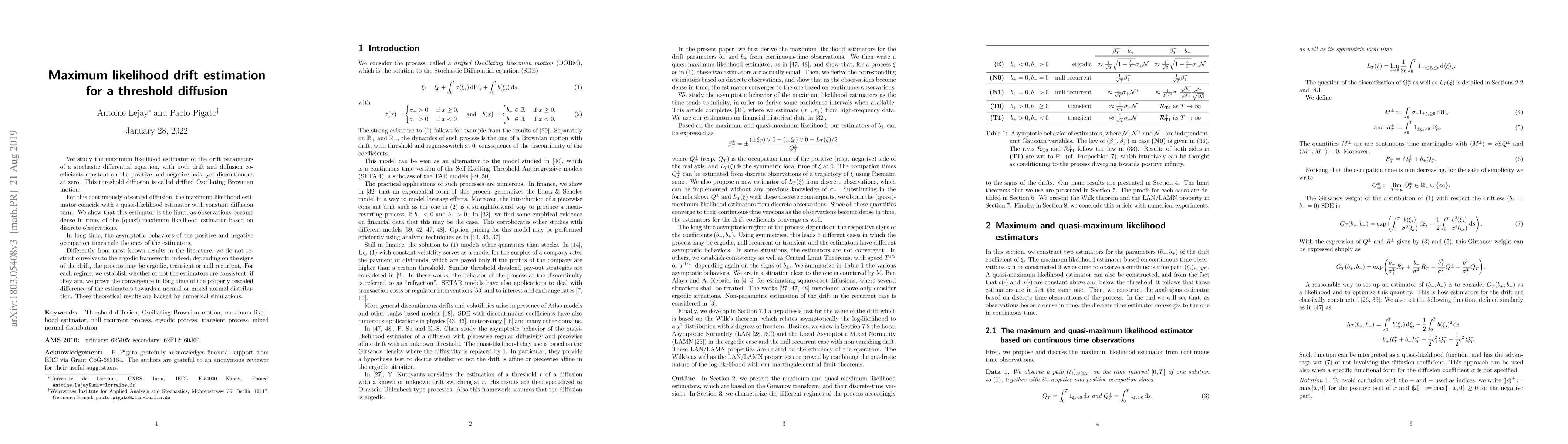 This paper investigates the maximum likelihood estimator for drift parameters in a threshold diffusion model, demonstrating its equivalence to a quasi-likelihood estimator for continuous observations. It explores the consistency and asymptotic behavior of these estimators across different dynamical regimes, supported by numerical simulations.