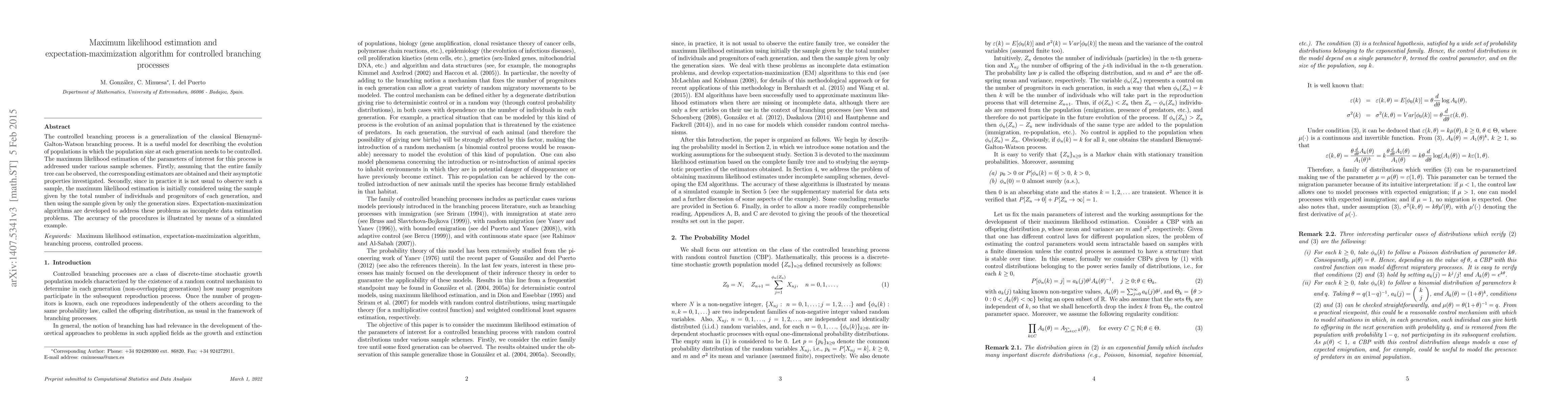 This paper investigates maximum likelihood estimation for controlled branching processes, developing estimators under various sample schemes. It employs Expectation-Maximization algorithms for incomplete data scenarios and demonstrates the accuracy of the proposed methods through a simulated example.