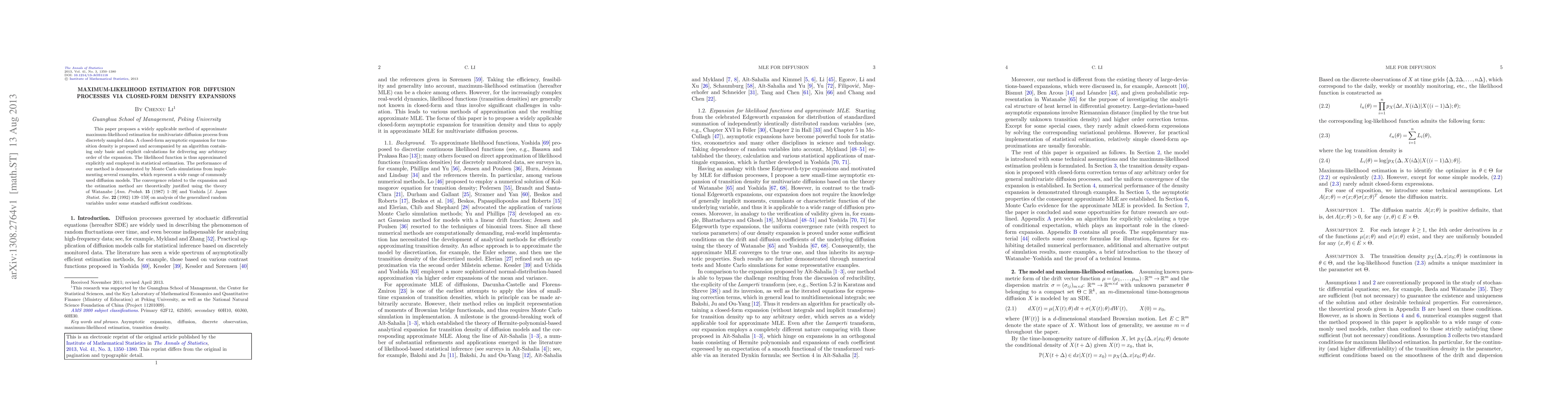 This paper introduces a method for approximate maximum-likelihood estimation of multivariate diffusion processes using discrete data, employing a closed-form asymptotic expansion for transition density. The method is demonstrated through Monte Carlo simulations and is theoretically justified using established results from the analysis of generalized random variables.
