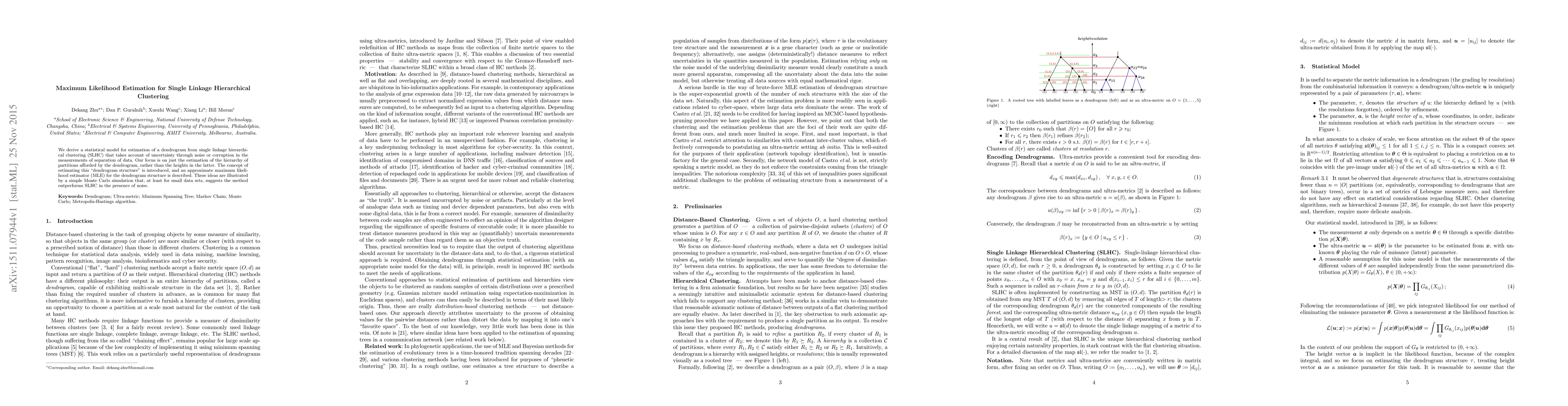 We derive a statistical model for estimation of a dendrogram from single linkage hierarchical clustering (SLHC) that takes account of uncertainty through noise or corruption in the measurements of separation of data. Our focus is on just the estimation of the hierarchy of partitions afforded by the dendrogram, rather than the heights in the latter. The concept of estimating this "dendrogram structure'' is introduced, and an approximate maximum likelihood estimator (MLE) for the dendrogram structure is described. These ideas are illustrated by a simple Monte Carlo simulation that, at least for small data sets, suggests the method outperforms SLHC in the presence of noise.