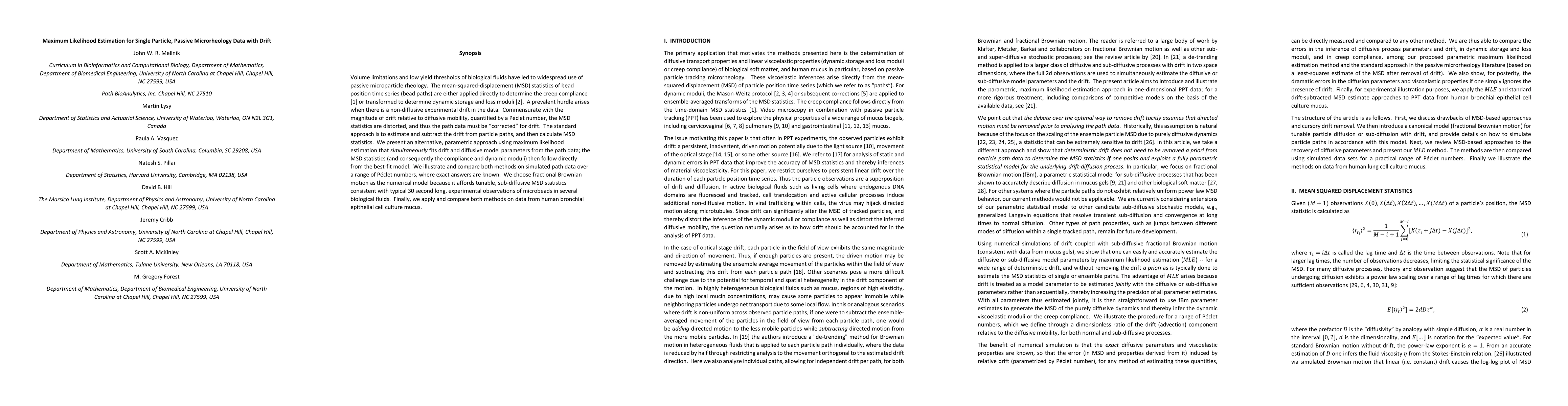 Volume limitations and low yield thresholds of biological fluids have led to widespread use of passive microparticle rheology. The mean-squared-displacement (MSD) statistics of bead position time series (bead paths) are either applied directly to determine the creep compliance [Xu et al (1998)] or transformed to determine dynamic storage and loss moduli [Mason & Weitz (1995)]. A prevalent hurdle arises when there is a non-diffusive experimental drift in the data. Commensurate with the magnitude of drift relative to diffusive mobility, quantified by a P\'eclet number, the MSD statistics are distorted, and thus the path data must be "corrected" for drift. The standard approach is to estimate and subtract the drift from particle paths, and then calculate MSD statistics. We present an alternative, parametric approach using maximum likelihood estimation that simultaneously fits drift and diffusive model parameters from the path data; the MSD statistics (and consequently the compliance and dynamic moduli) then follow directly from the best-fit model. We illustrate and compare both methods on simulated path data over a range of P\'eclet numbers, where exact answers are known. We choose fractional Brownian motion as the numerical model because it affords tunable, sub-diffusive MSD statistics consistent with typical 30 second long, experimental observations of microbeads in several biological fluids. Finally, we apply and compare both methods on data from human bronchial epithelial cell culture mucus.