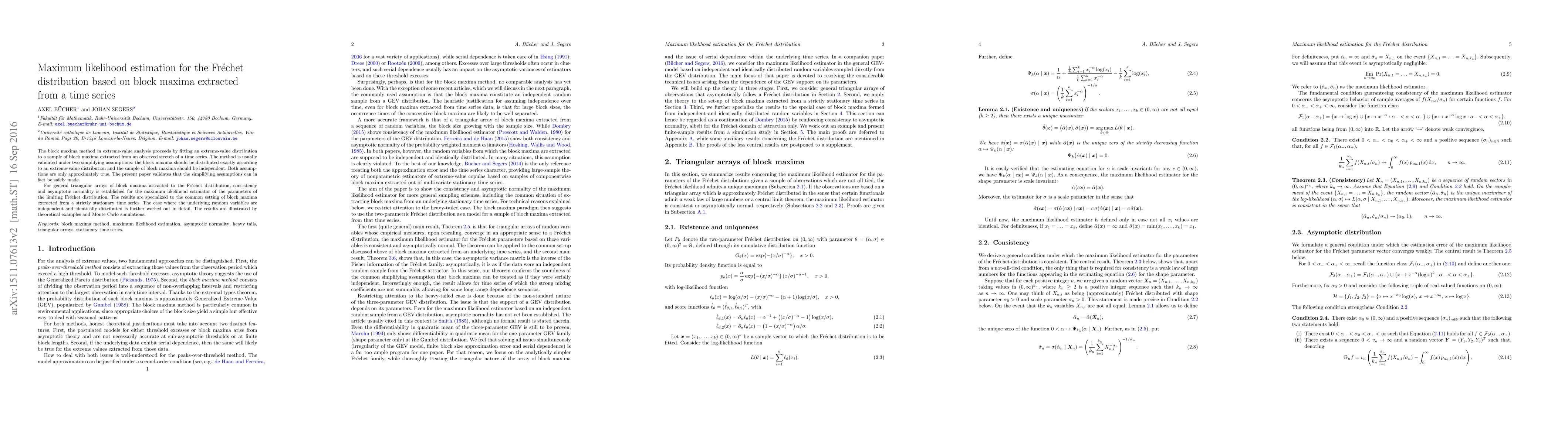This paper develops maximum likelihood estimation for the Fréchet distribution using block maxima extracted from a time series, addressing the limitations of typical assumptions in extreme-value analysis. It establishes consistency and asymptotic normality for the estimator under general conditions and provides detailed results for independent and identically distributed variables, supported by theoretical examples and Monte Carlo simulations.