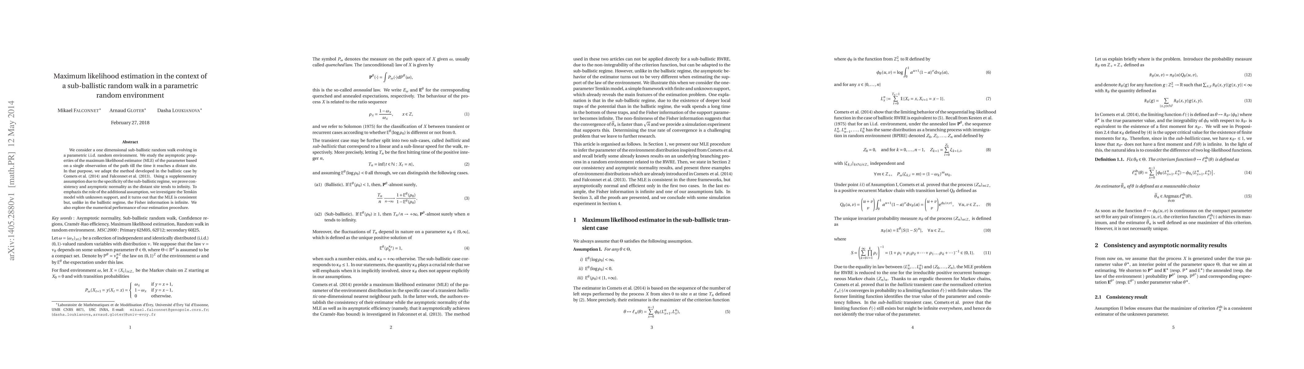 This paper investigates the maximum likelihood estimation (MLE) for a one-dimensional sub-ballistic random walk in a parametric i.i.d. random environment, proving its consistency and asymptotic normality. It contrasts the sub-ballistic regime with the ballistic regime, highlighting the infinite Fisher information in the former.