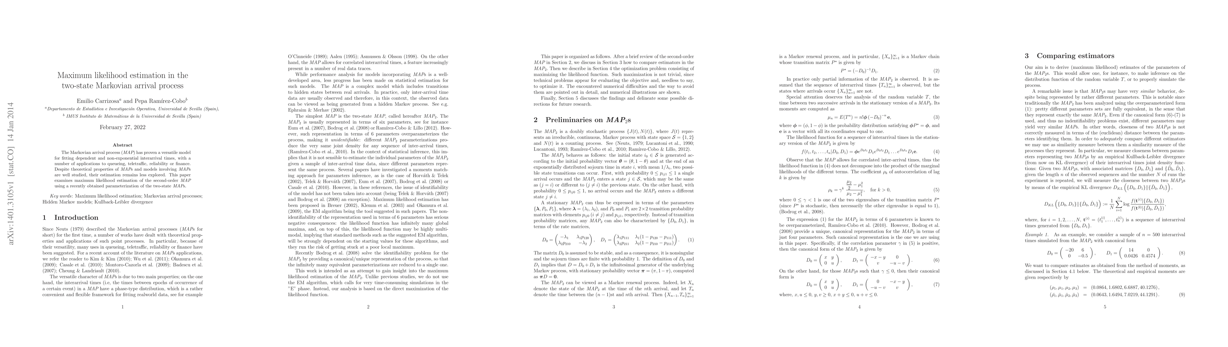 This paper investigates the maximum likelihood estimation of a two-state Markovian arrival process (MAP), focusing on its second-order properties and utilizing a newly developed parameterization to enhance estimation accuracy. The study aims to fill the gap in the literature regarding the practical estimation of MAPs.