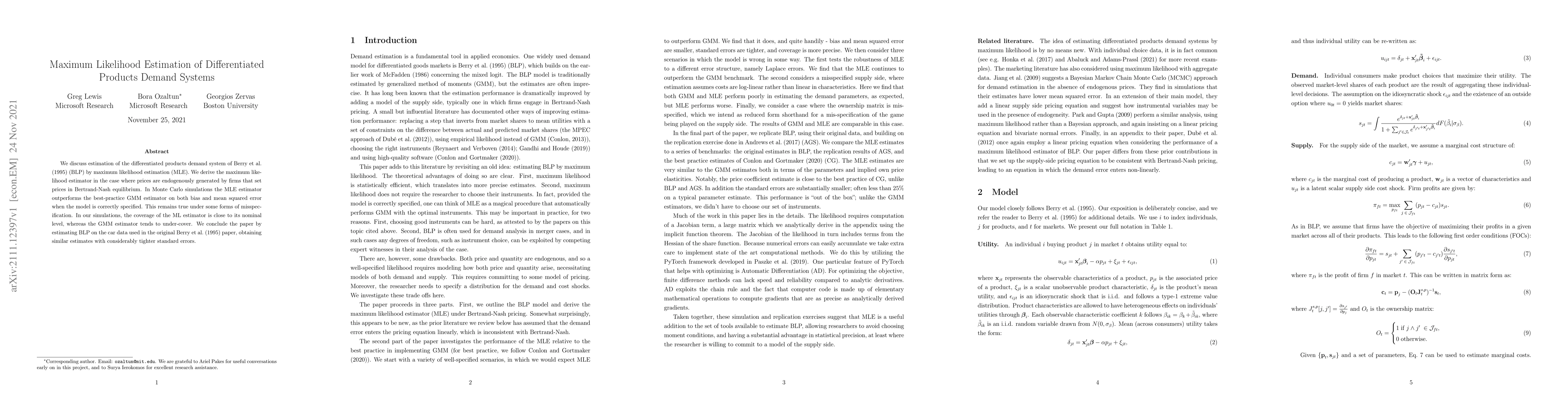 A study compares maximum likelihood estimation with best-practice Generalized Method of Moments (GMM) estimation for a differentiated products demand system, finding the MLE estimator outperforms GMM in terms of bias and mean squared error.